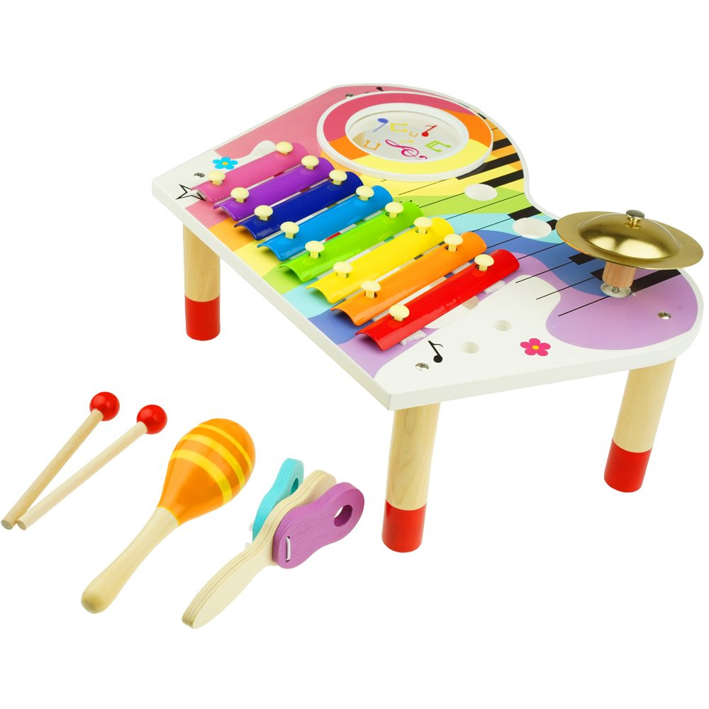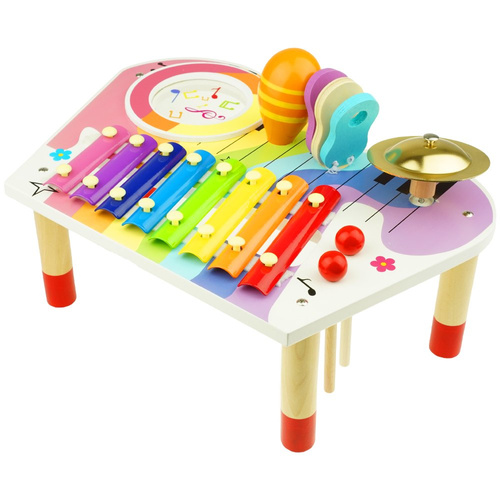 Drewniany stolik muzyczny to idealny pierwszy zestaw instrumentów dla małego dziecka już od 18 miesiąca życia.