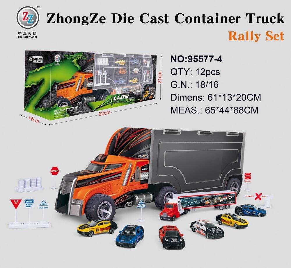 Duże auto ciężarowe 62cm długości jest to solidnie wykonany tir z błyszczącego plastiku załadowany siedmioma metalowymi resorakami plus dodatkowo elementy oznakowania wykorzystywane podczas remontów dróg.