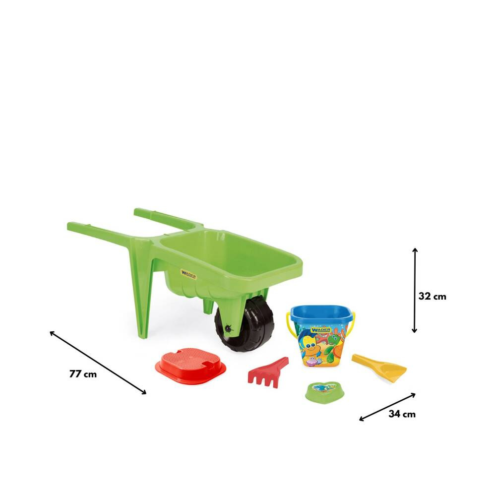 - Duża zielona Taczka Gigant marki Wader z akcesoriami do piasku, to rewelacyjna propozycja dla małych ogrodników i fanów zabawy na zewnątrz.