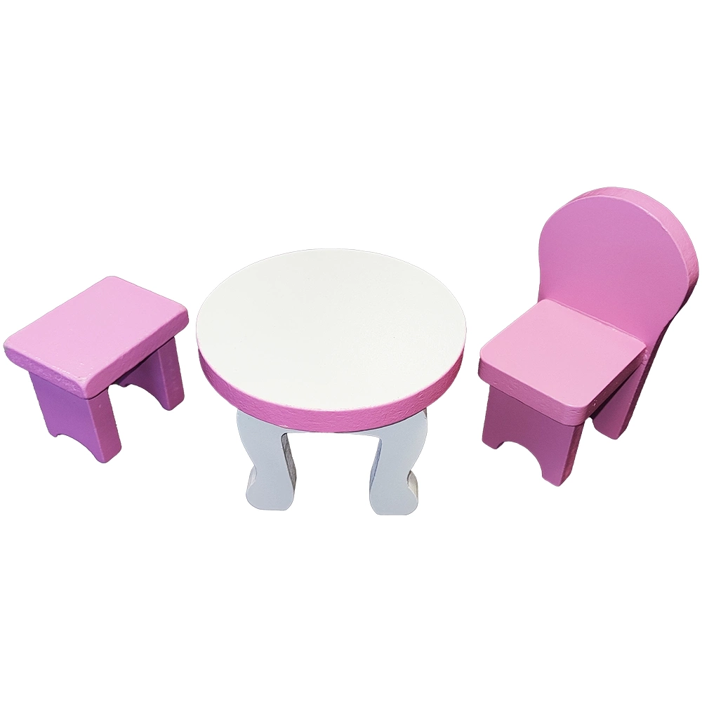 Urocze mebelki dla lalek wykonane z drewna. Zestaw mebli może stanowić wyposażenie jadalni. Jest to doskonały dodatek do domków dla lalek.