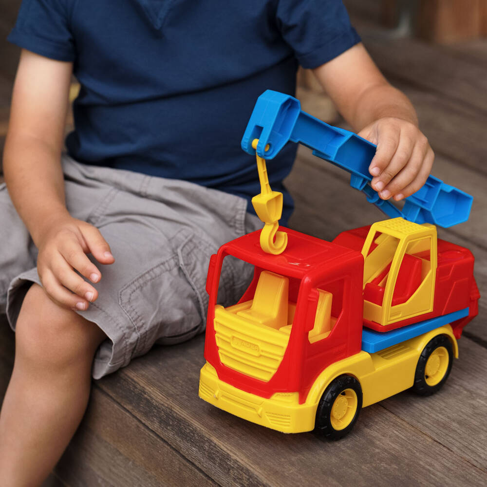 Samochód typu dźwig, wykorzystywany jest do prac przeładunkowych, przenoszenia dużych gabarytowo i ciężkich materiałów, zatem bez niego niemożliwe jest wykonywanie jakichkolwiek prac budowlanych. Zaletą tego pojazdu jest możliwość swobodnego poruszania się po placu budowy. Dźwig z serii Tech Truck jest pojazdem mobilnym, zwrotnym i wytrzymałym o długości 26 cm, w atrakcyjnej kolorystyce. Zabawka posiada ruchomą podstawę z kabiną operatora oraz ruchome i wysuwane ramię z zamontowanym na końcu hakiem. Dołączone do pojazdu podpory stabilizują i zabezpieczają dźwig w trakcie pracy.