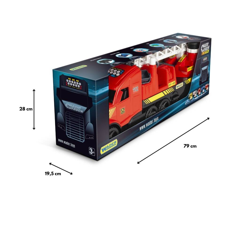 Magic Truck Action – Straż Pożarna jak na prawdziwy wóz strażacki przystało, posiada wysuwaną, ruchomą drabinę, na końcu której znajduje się kosz dla strażaka, pompkę oraz wąż, z którego, po napełnieniu zbiorniczka, tryska woda. Obrotowe elementy sprawiają, że strumień wody można skierować w dowolną stronę. Skrętną naczepę można przyczepić do kabiny na dwa sposoby, przez co auto może osiągnąć długość 80 cm. Dodatkowo została ona wyposażona w wysuwane nóżki podporowe, dzięki czemu może również stać samodzielnie. Pojazd wykonany jest z materiałów bezpiecznych dla dzieci. Ogromną zaletą jest trwałość i wytrzymałość konstrukcji, co sprawia, że zabawka może służyć dzieciom latami.