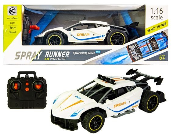 Zdalnie sterowany sportowy samochód wyścigowy, który sprawdzi się zarówno u młodszych jak i starszych użytkowników. Zabawka jeździ we wszystkich kierunkach, a do jej sterowania służy prosty w obsłudze pilot. Gumowe opony są przystosowane do pokonywania przeszkód. Dodatkową atrakcją jest dźwięk oraz świecący tylny wydech, z którego podczas jazdy wydobywa się para wodna imitująca dym.