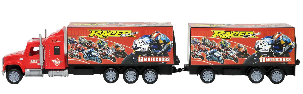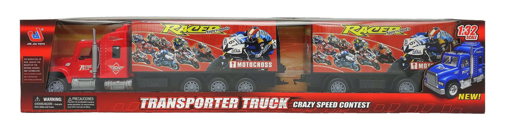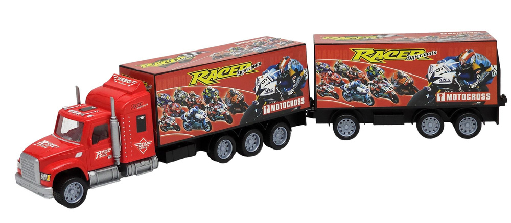Ciężarówka z przyczepą wiernie odwzorowuje prawdziwy pojazd. Wykonana w skali 1:32 została stworzona na wzór amerykańskich ciężarówek. Posiada napęd typu friction. Na naczepach ciężarówki znajdują się realistyczne grafiki dzięki czemu pojazd prezentuje się bardzo okazale. Z całą pewnością zabawka zachwyci wszystkich małych miłośników motoryzacji, sprawiając im sporo radości.