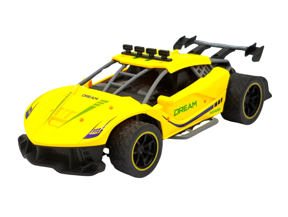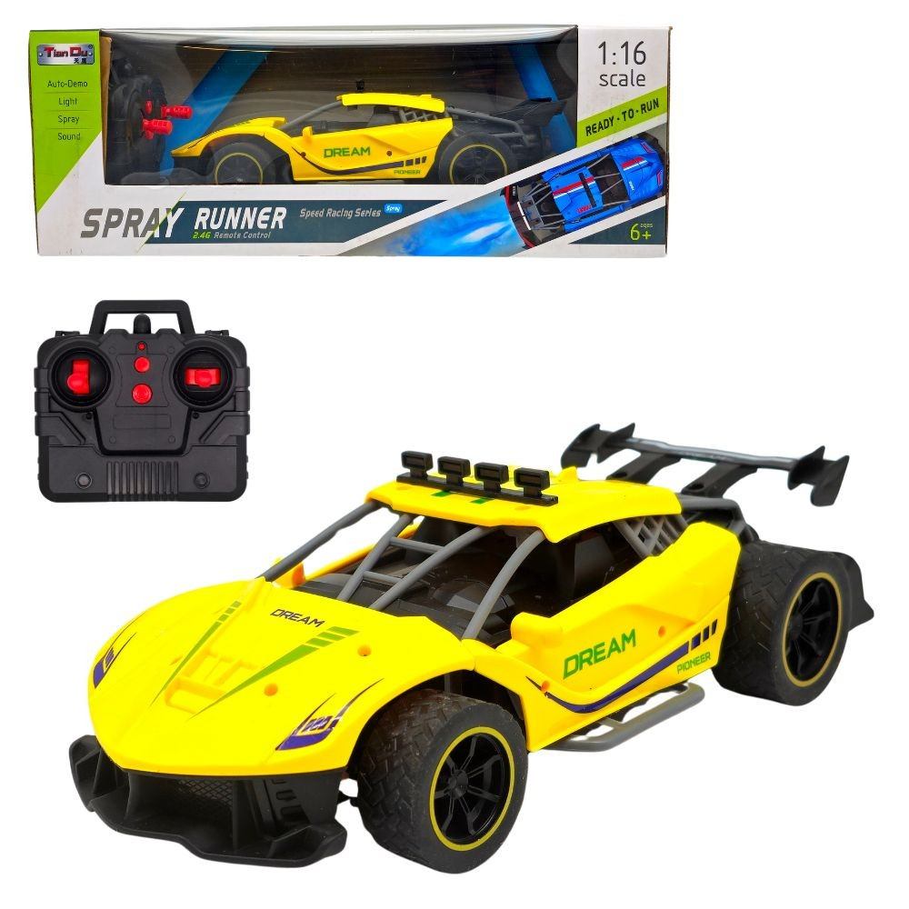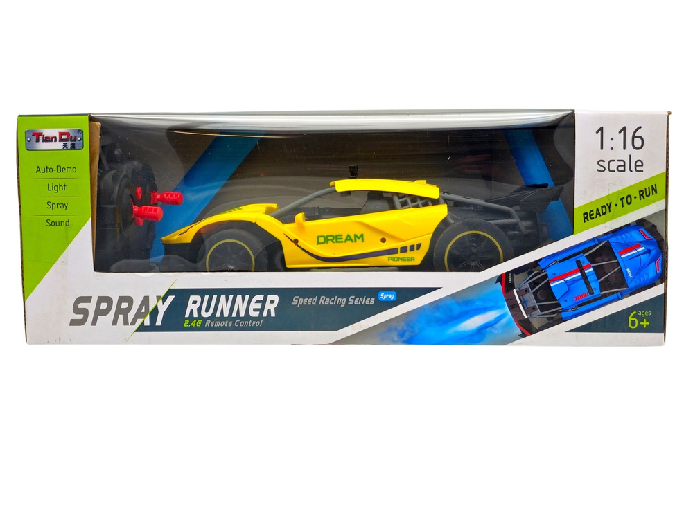 Zdalnie sterowany sportowy samochód wyścigowy, który sprawdzi się zarówno u młodszych jak i starszych użytkowników. Zabawka jeździ we wszystkich kierunkach, a do jej sterowania służy prosty w obsłudze pilot. Gumowe opony są przystosowane do pokonywania przeszkód. Dodatkową atrakcją jest dźwięk oraz świecący tylny wydech, z którego podczas jazdy wydobywa się para wodna imitująca dym.