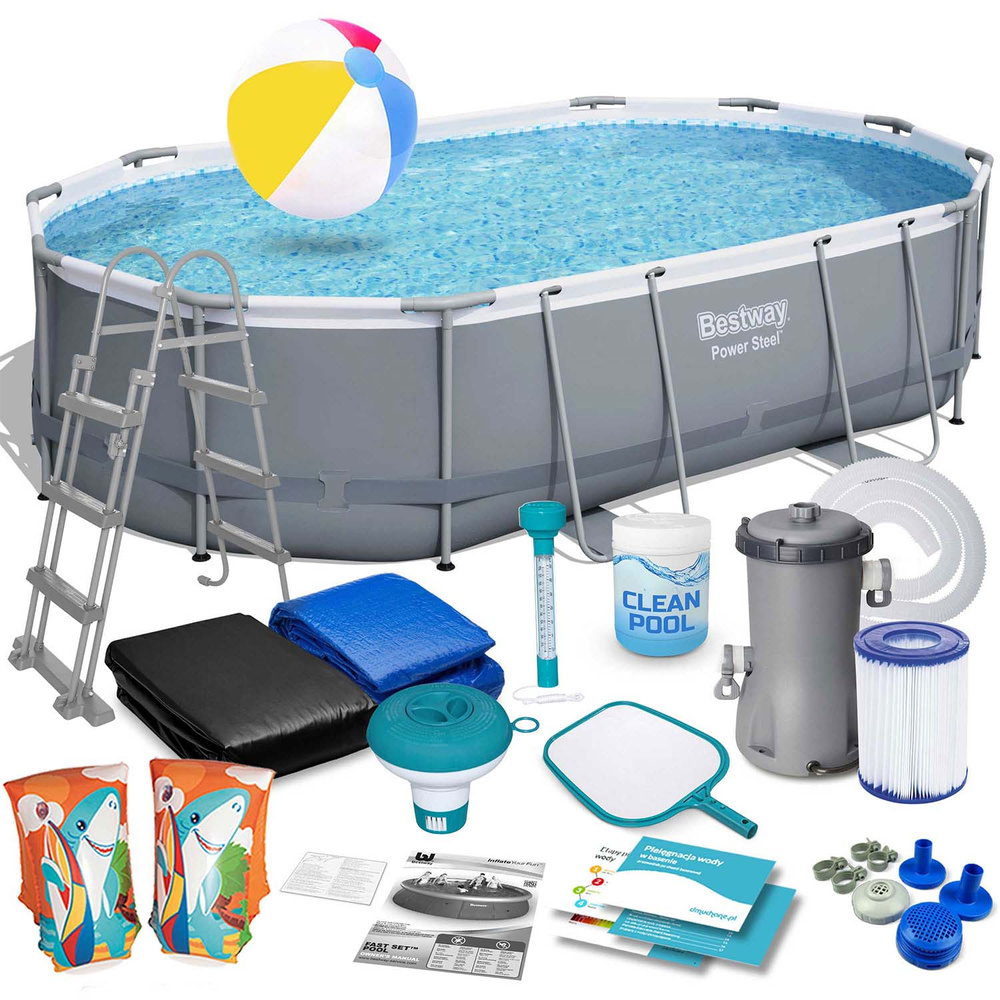 - Basen ogrodowy stelażowy Bestway Power Steel 488 x 305 x 107 cm. Zestaw 18w1: pompa filtrująca, filtr typ II, dozownik ChemConnect™, drabinka, pokrywa, mata pod basen, chemia basenowa, termometr, pływający dozownik, siatka do czyszczenia, zestaw naprawczy