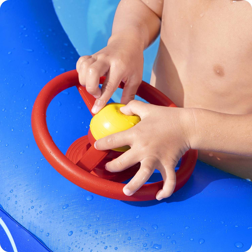 - Atrakcyjny design: Kolorowa grafika z motywem morskiego kapitana oraz dmuchana kierownica z klaksonem zachęcają dzieci do aktywnej zabawy.
