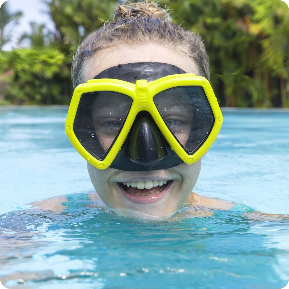 - Maska do pływania Bestway w kolorze żółtym, przeznaczona dla młodzieży i dorosłych. Wykonana z hypoalergicznego materiału, zapewnia komfort i doskonałą widoczność podczas podwodnych przygód.