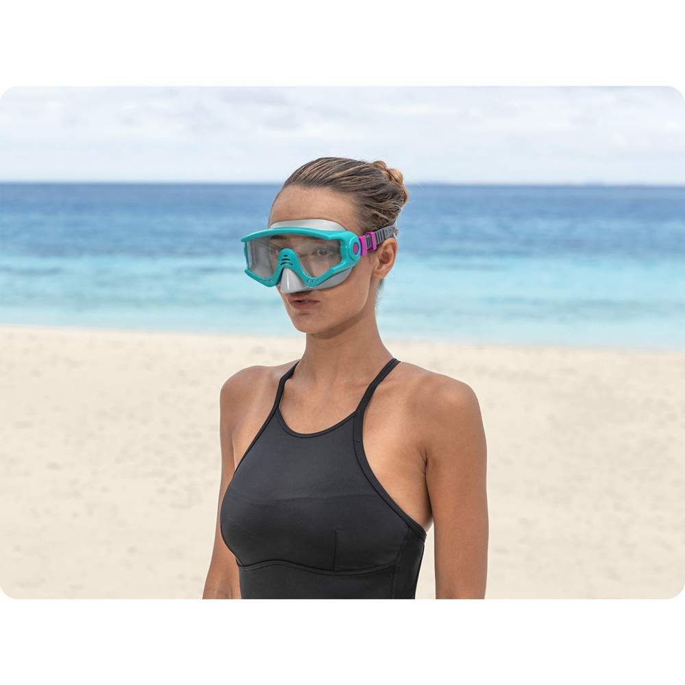 - Turkusowa maska do pływania Bestway zapewnia doskonałą widoczność i komfort podczas nurkowania. Wykonana z trwałych materiałów, idealnie dopasowuje się do twarzy, gwarantując szczelność i wygodę użytkowania.