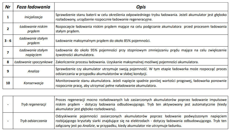| Zabezpieczenia | Nadnapięciowe >16VDC (tryb 12V), >32V (tryb 24V), odłączenie napięcia wyjściowego Zwarciowe Odłączenie napięcia wyjściowego, informacja na wyświetlaczu |