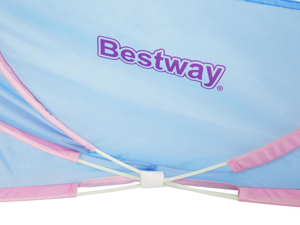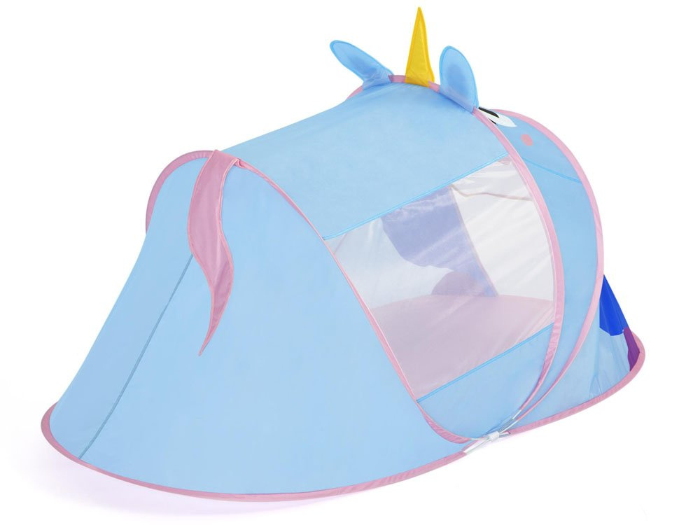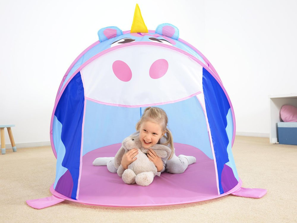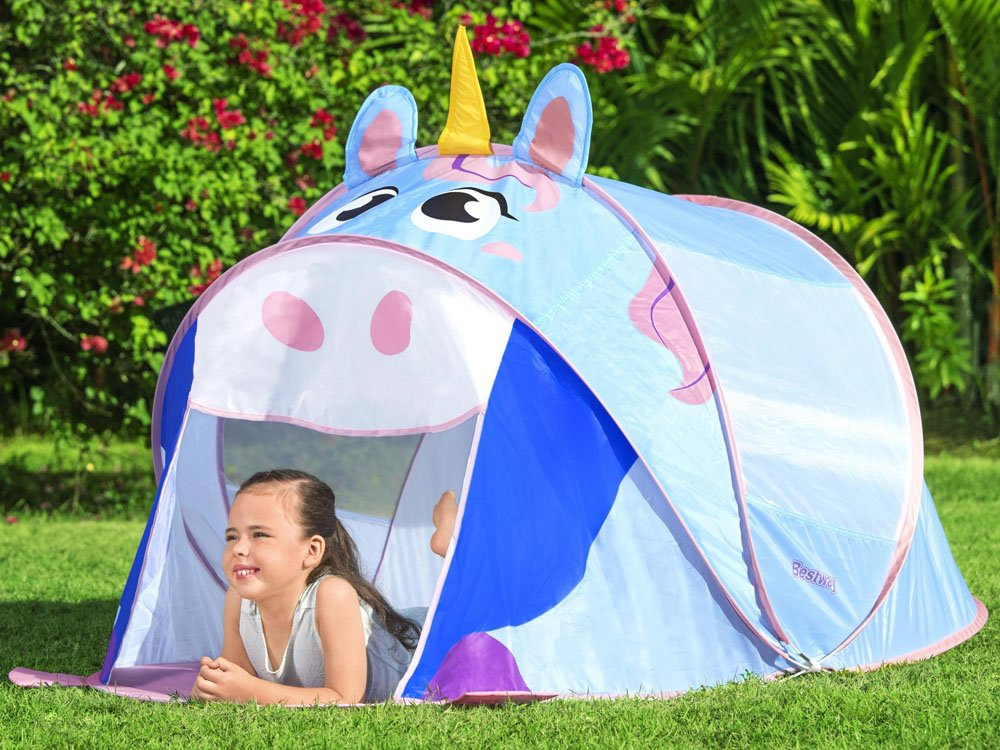 Namiot AdventureChasers ™ Jednorożec Bestway to propozycja dla każdego dziecka uwielbiającego bajkowe jednorożce. Namiot w kolorystyce i grafice jednorożca zapewni mnóstwo kreatywnej zabawy każdemu dziecku, będzie sprzyjał wymyślaniu niezwykłych przygód bajkowych koników. Samo rozkładalny namiot można rozstawić w dowolnym miejscu w domu, na tarasie, ogrodzie na plaży, nad morzem jeziorem, polu namiotowym. Namiot posiada wejście, po bokach przejrzystą siateczkę dla dobrej wentylacji oraz do wglądu dla rodziców co jego pociecha poczynia. Namiot z podłogą pozwala na umieszczenie w nim materaca ze śpiworem (68111 Bestway), dzięki czemu dziecko będzie miało totalny komfort.