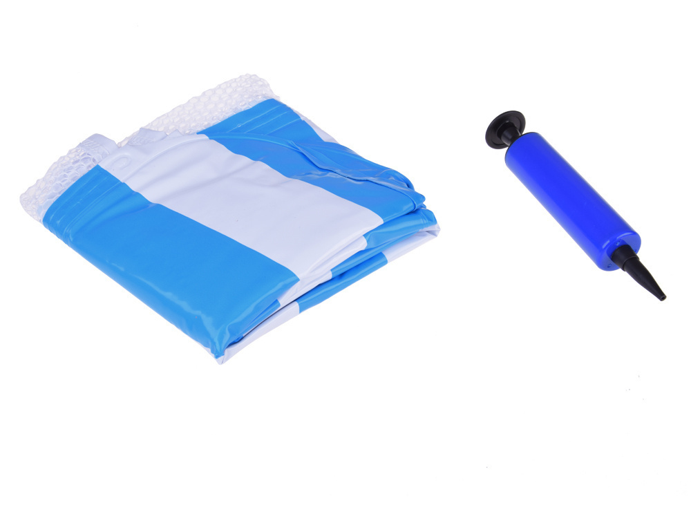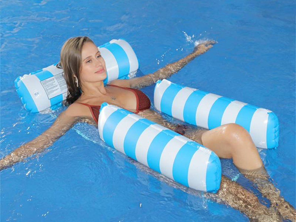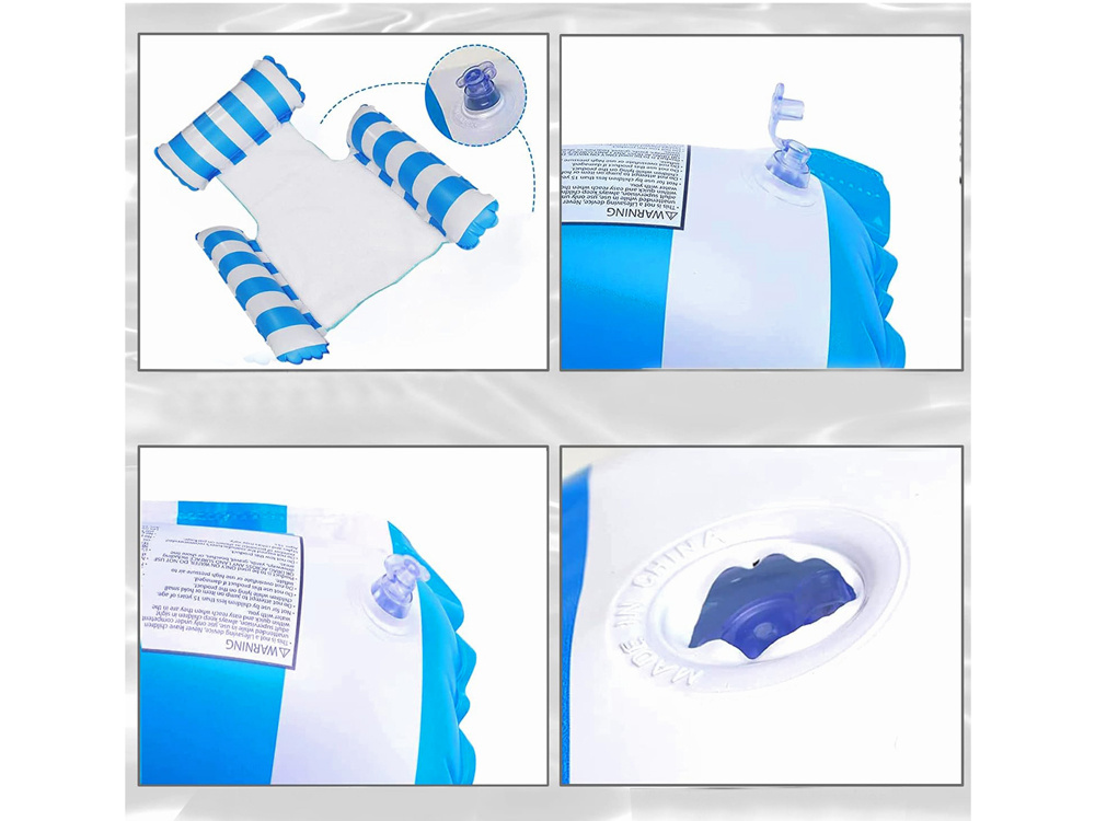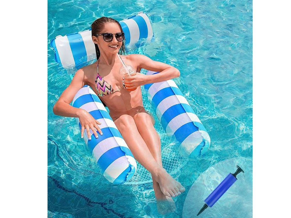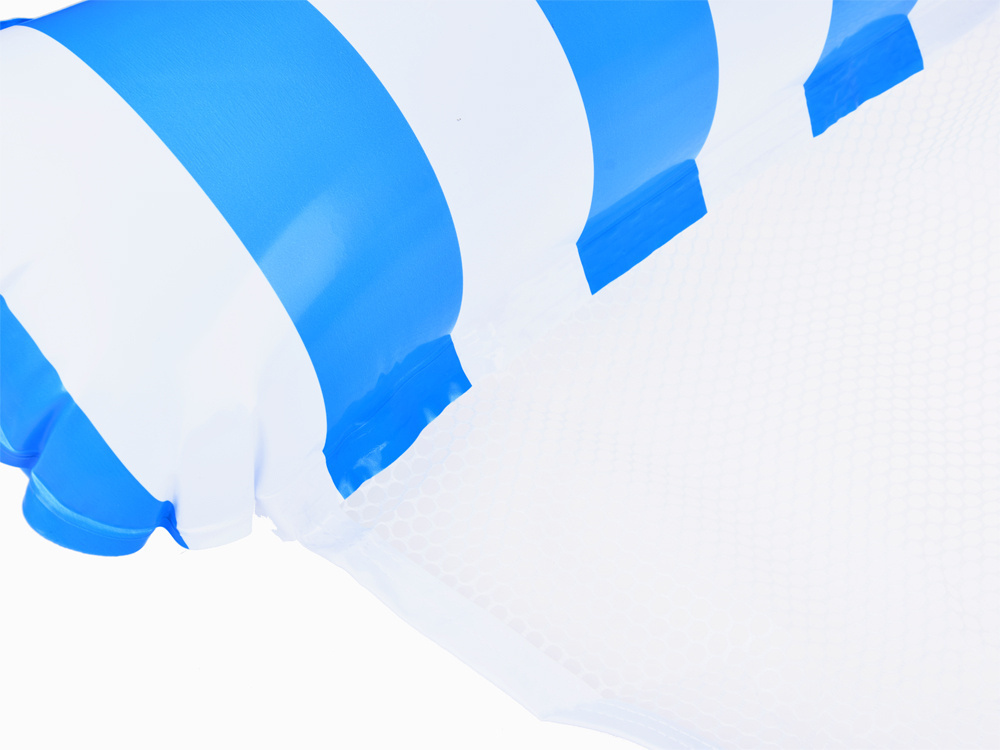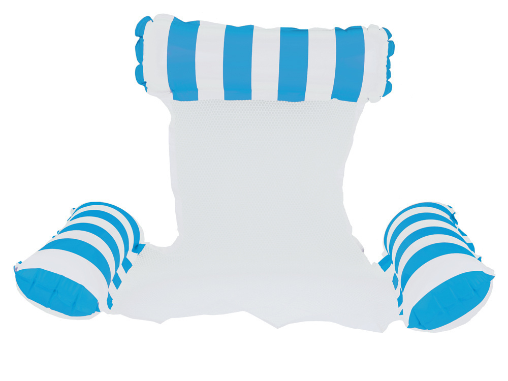 - Dmuchany fotel hamak wodny siatka, model w paski na basen i plażę, Fotel do pływania jest niebieski i biały w paski.
