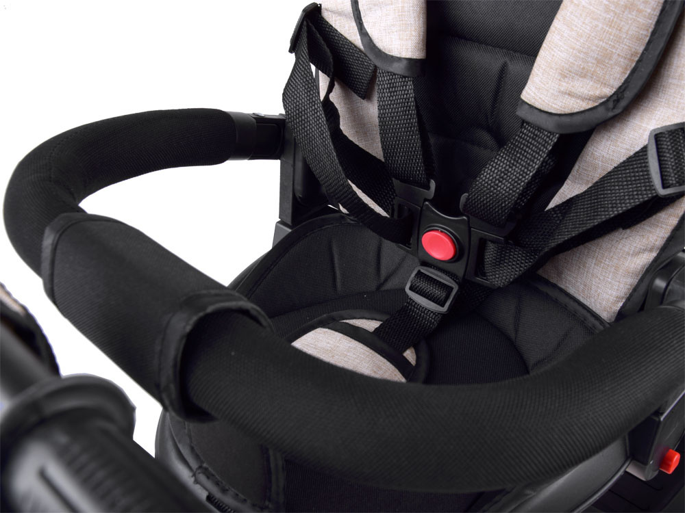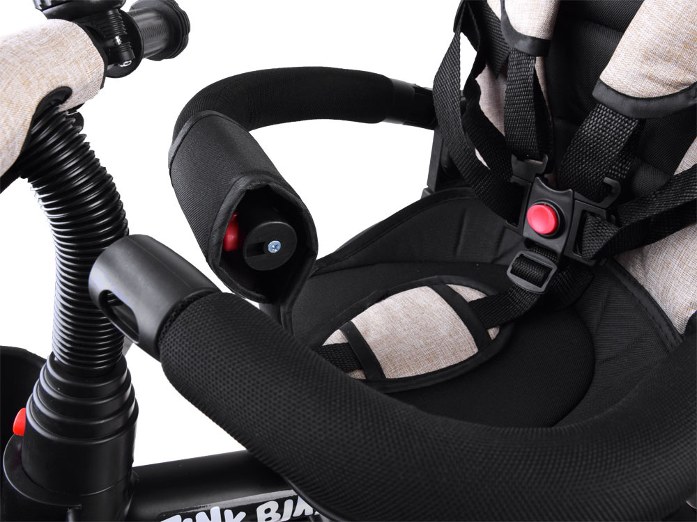 Beżowy rowerek trójkołowy 3w1 posiada: