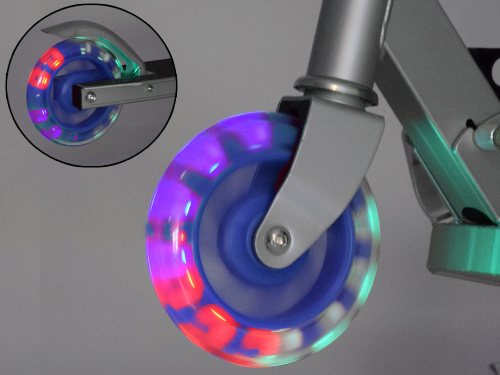 • Świecące Kółka: Koła wyposażone w diody LED, które świecą podczas jazdy, zwiększając widoczność i atrakcyjność hulajnogi. Diody nie wymagają baterii, ponieważ działają dzięki energii magnetycznej generowanej podczas kręcenia się kół.