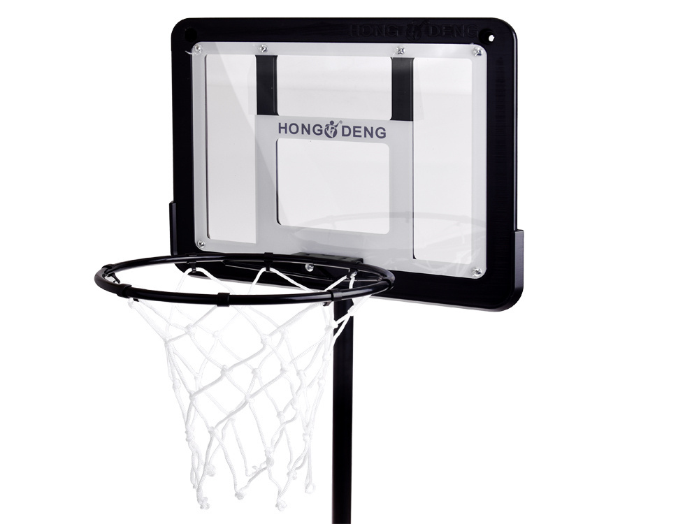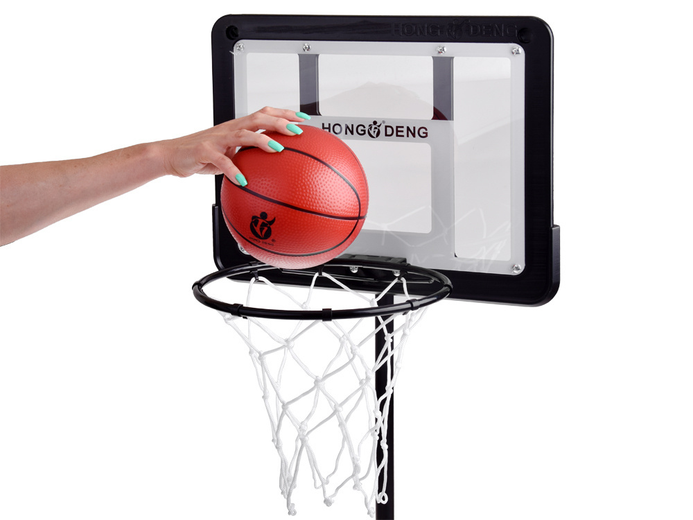 Dodatkowe akcesoria w zestawie. W zestawie oprócz konstrukcji stojaka znajdziemy oczywiście tablicę, metalową obręcz z poliestrową siatką a także gumową piłkę wraz z pompką. Jeśli tylko mamy pod ręką wypełnienie podstawy (piasek lub wodę) śmiało możemy zacząć rozgrywkę!