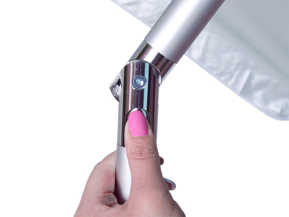 - System blokowania i zwalniania – bezpieczne składanie i rozkładanie (przycisk zwalniający pod dachem).