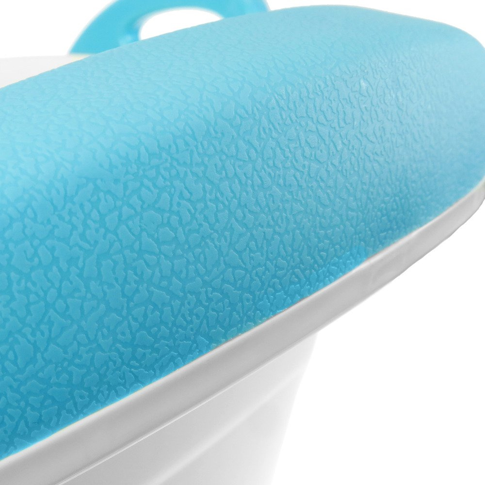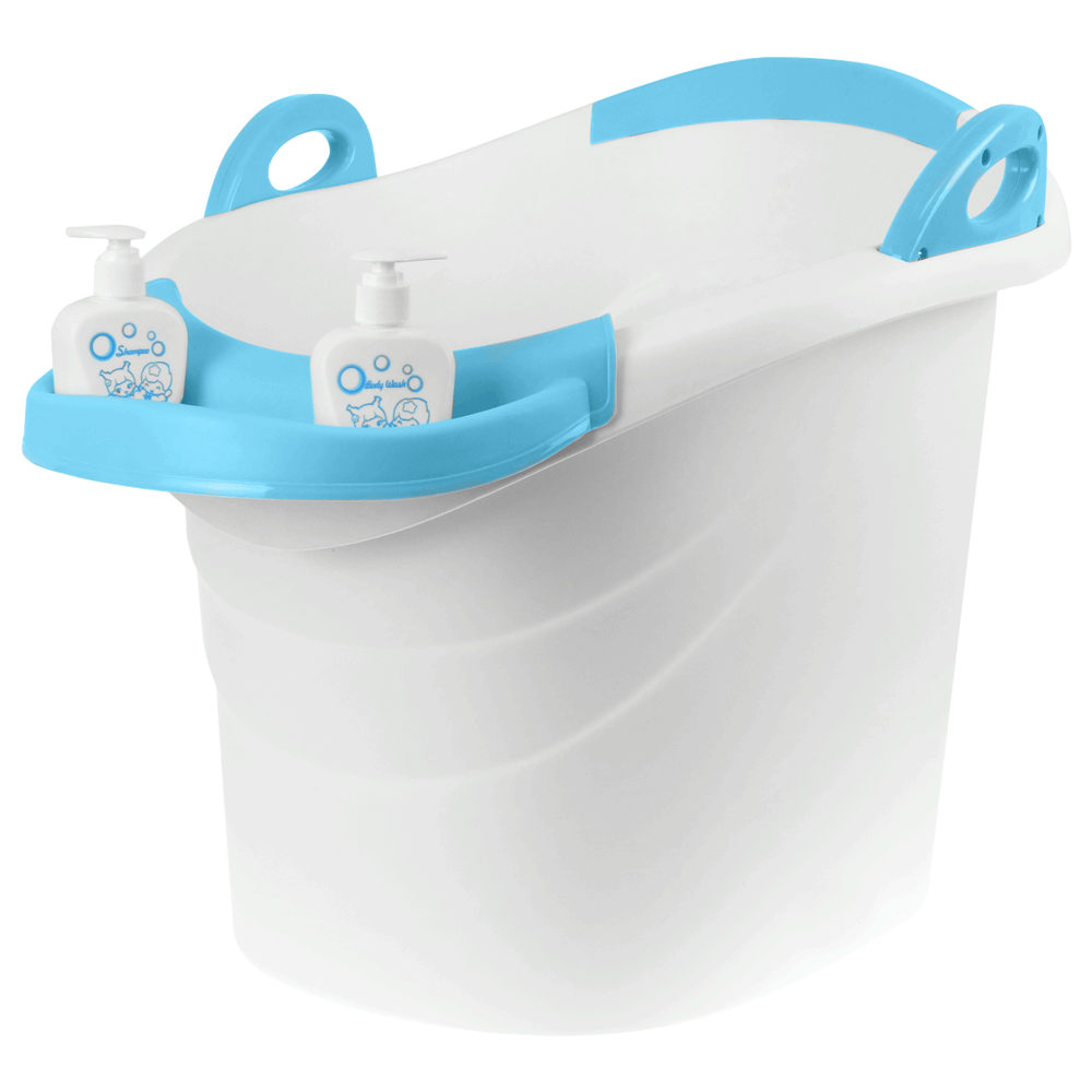 W zestawie znajduje się wyciągane siedzisko dla dziecka oraz zdejmowana półka z 2 buteleczkami na płyny do kąpieli. Posiada gumowany korek spustowy oraz uchwyty ułatwiające przenoszenie wanienki.