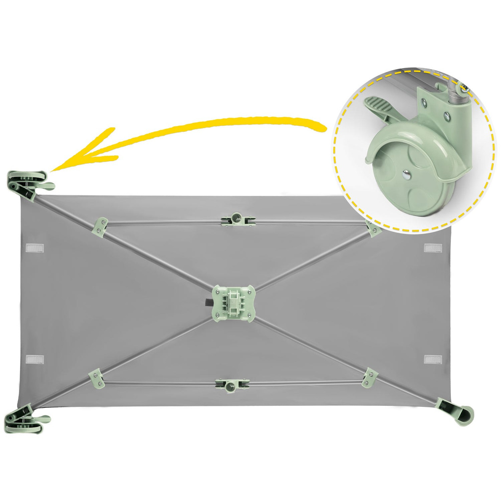 Kółeczka pozwalają na bezproblemowe przesuwanie łóżeczka z miejsca na miejsce. Po jego ustawieniu można zablokować kółka, by stało ono bezpiecznie.