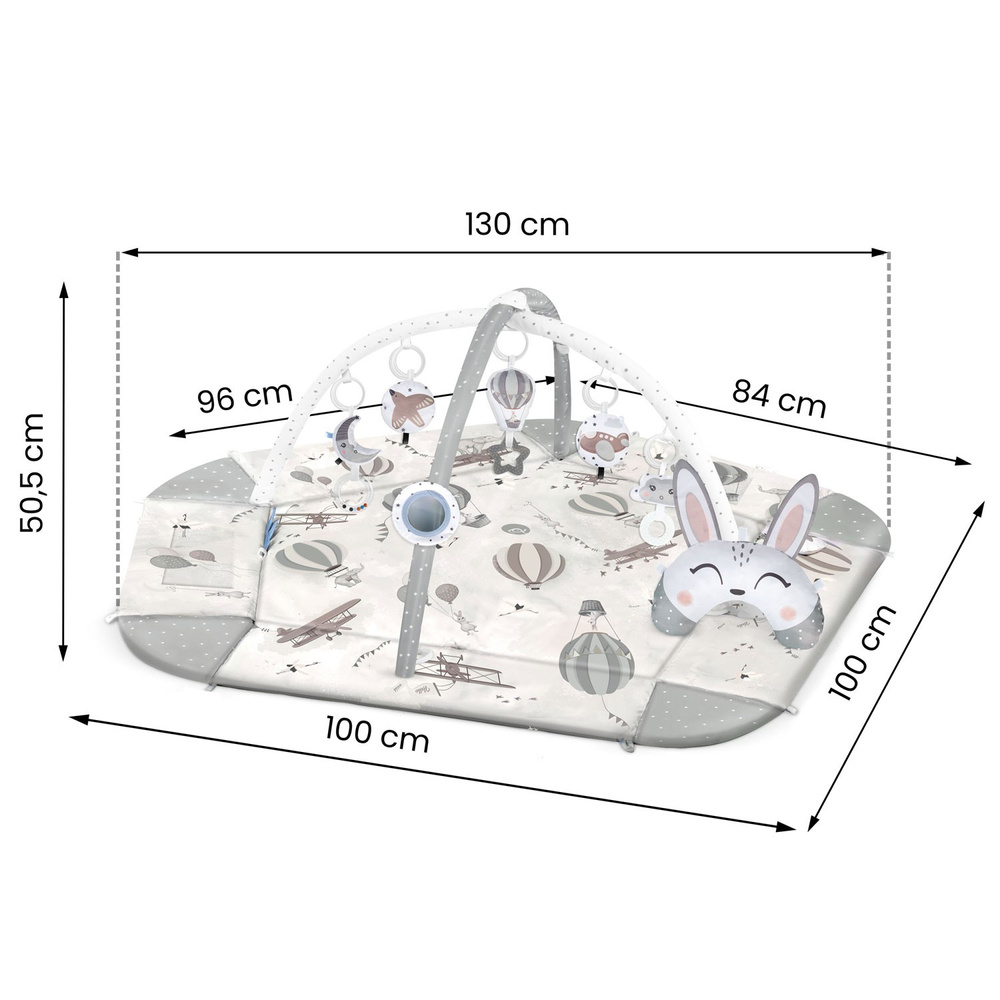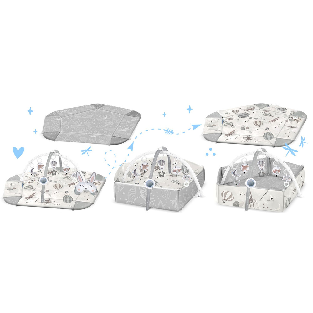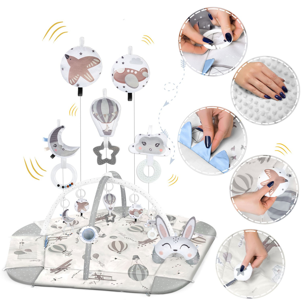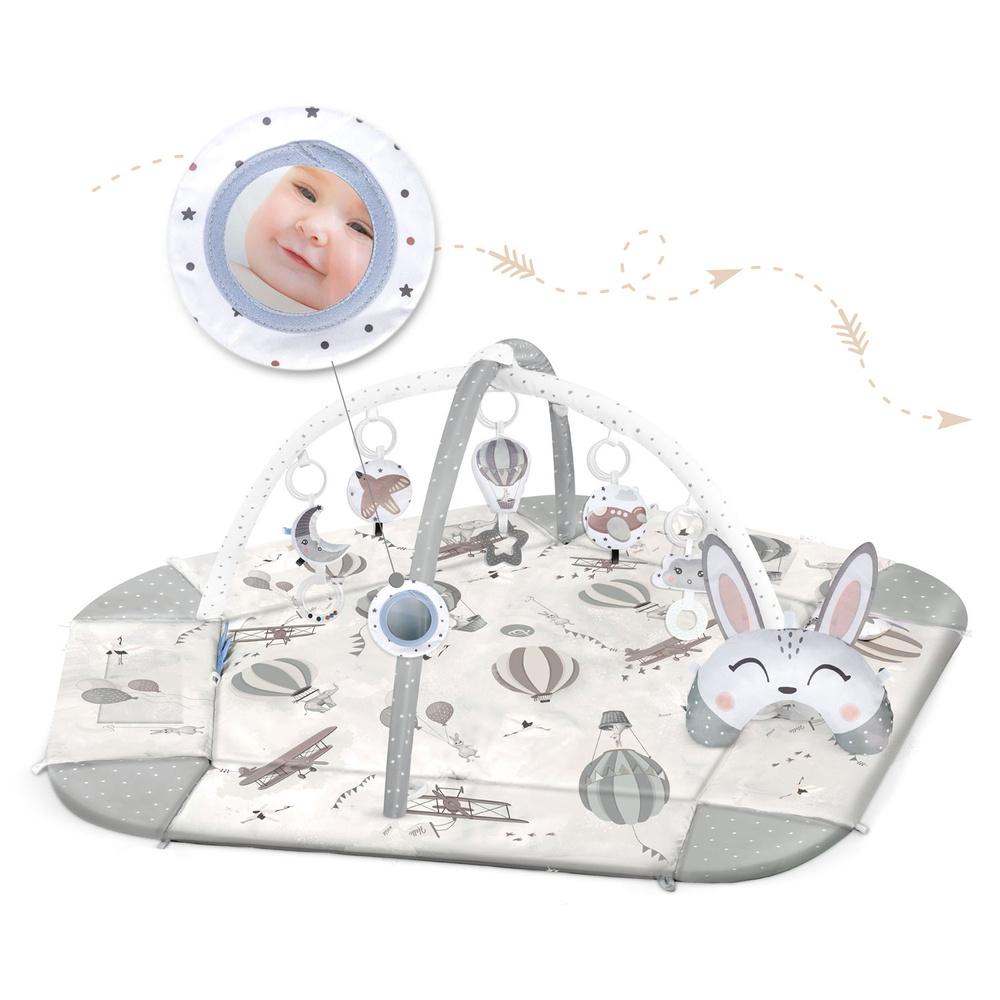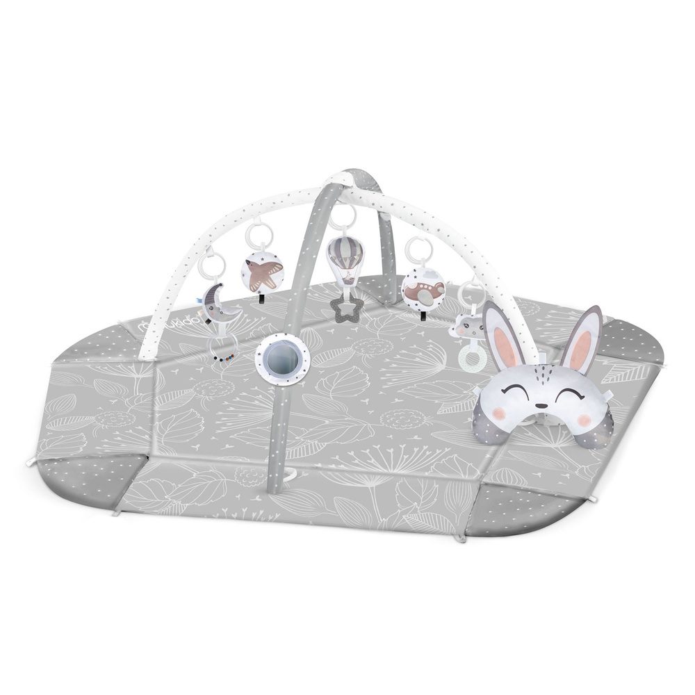 - zestaw zawiera: matę, 5 ścianek, 2 pałąki, 7 wielofunkcyjnych zabawek w tym GRATIS poduszkę do leżenia na brzuchu,