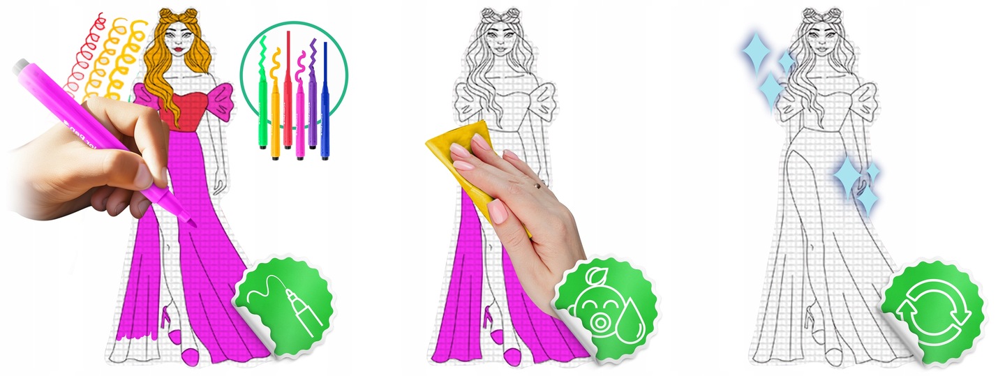 ✅ Nielimitowana zabawa — wielorazowa, zmywalna, a w zestawie znajdziesz GRATIS komplet mazaków, który wystarczy na długo. Gdy się zużyją, bez problemu zastąpisz je nowymi, zwykłymi flamastrami — mata nie wymaga dedykowanych mazaków.