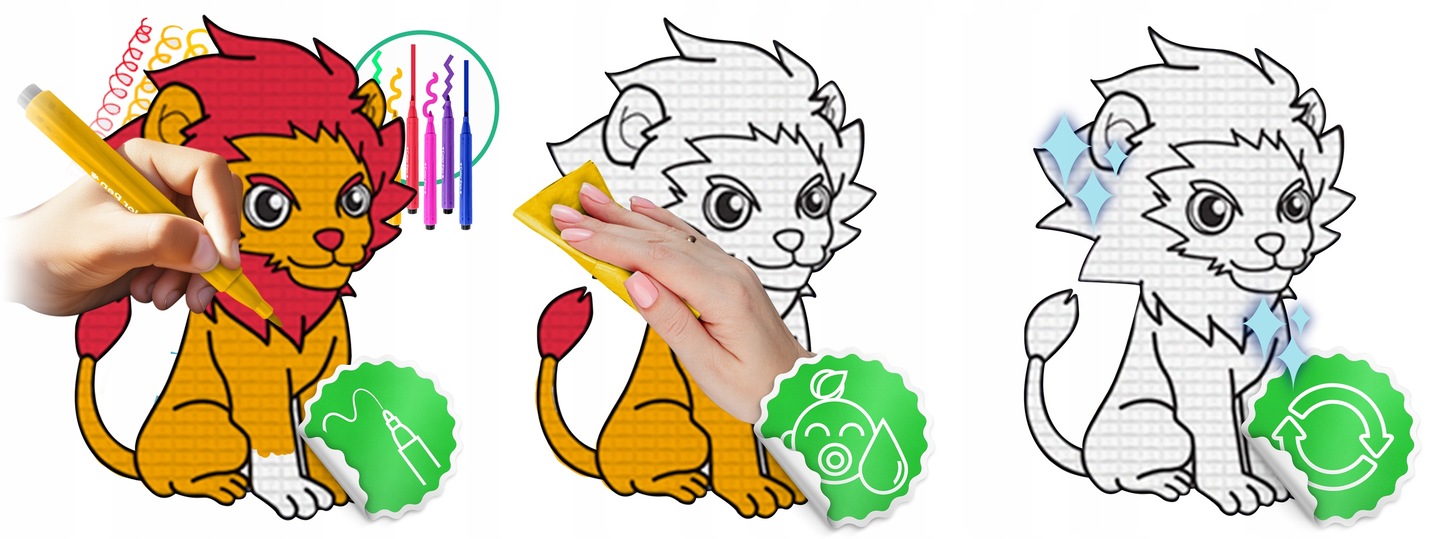 ✅ Nielimitowana zabawa — wielorazowa, zmywalna, a w zestawie znajdziesz GRATIS komplet mazaków, który wystarczy na długo. Gdy się zużyją, bez problemu zastąpisz je nowymi, zwykłymi flamastrami — mata nie wymaga dedykowanych mazaków.