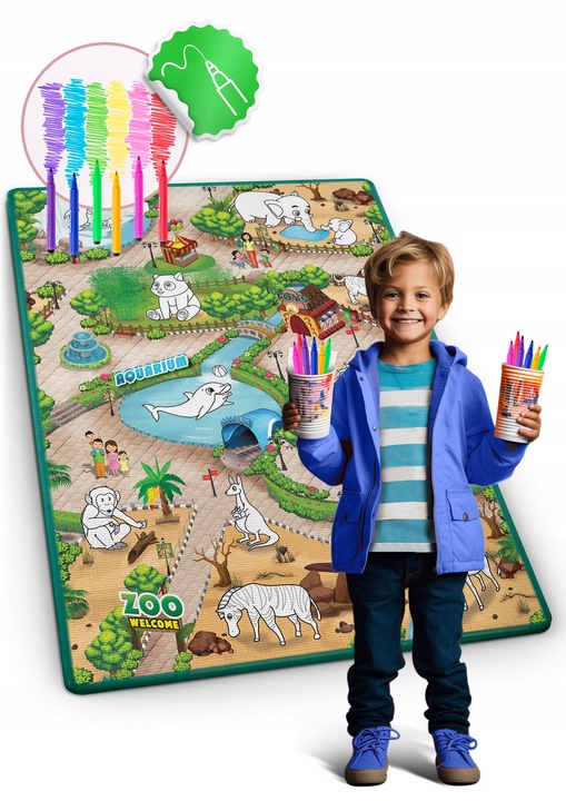 - Duża mata XXL do kolorowania 200x120 cm z mazakami GRATIS! Miękka, zmywalna i bezpieczna pianka EVA. Idealna do rysowania, nauki raczkowania i zabawy. Wodoodporna, rolowana i łatwa w czyszczeniu – jakość premium dla dzieci.