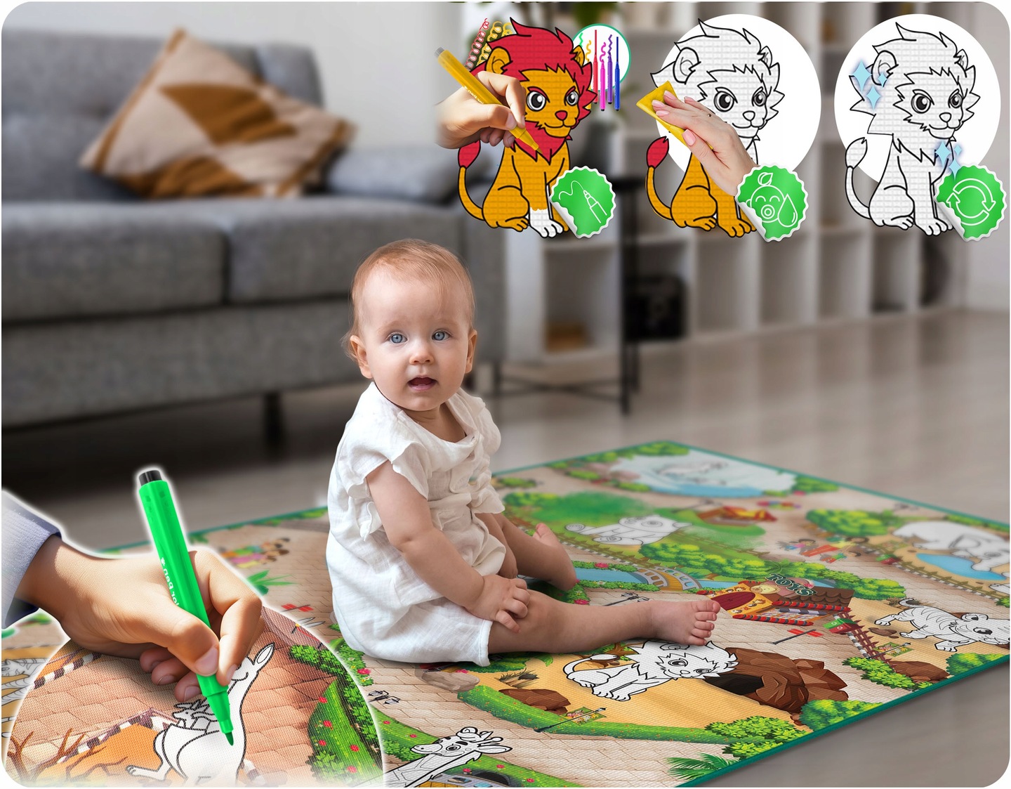 Mata do kolorowania, będąca częścią zestawu, została zaprojektowana w sposób, który gwarantuje łatwe czyszczenie. Wystarczy przetrzeć ją wilgotną szmatką, by znów była gotowa do zabawy. Dzięki temu dzieci zawsze będą czyste, a Twoje mieszkanie pozostanie nieskazitelne.