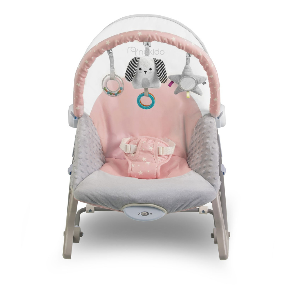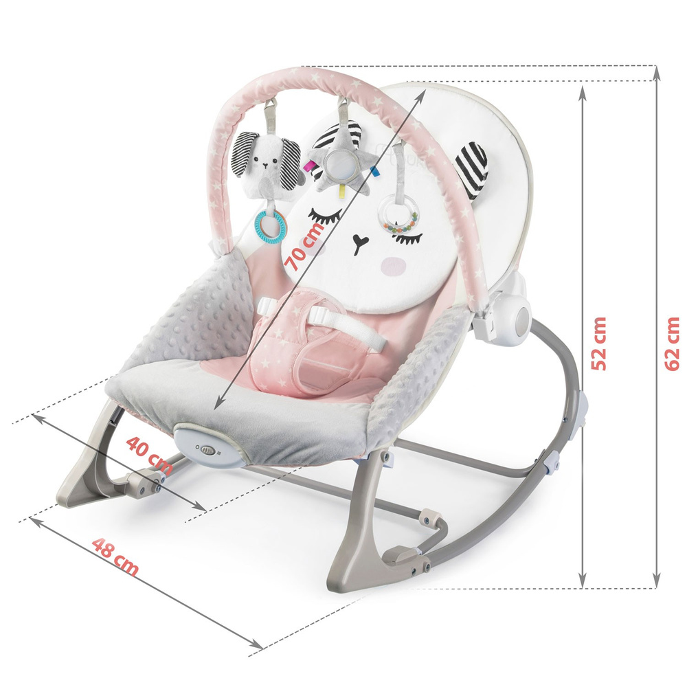 Leżaczek został wyposażony w zdejmowany pałąk z przyczepionymi szeleszczącymi zabawkami.. Zapewnią one Twojemu dziecku rozrywkę, podczas gdy Ty będziesz mógł odpocząć. Te wyjątkowe zabawki stymulują wzrok oraz rozwijają zmysł dotyku.