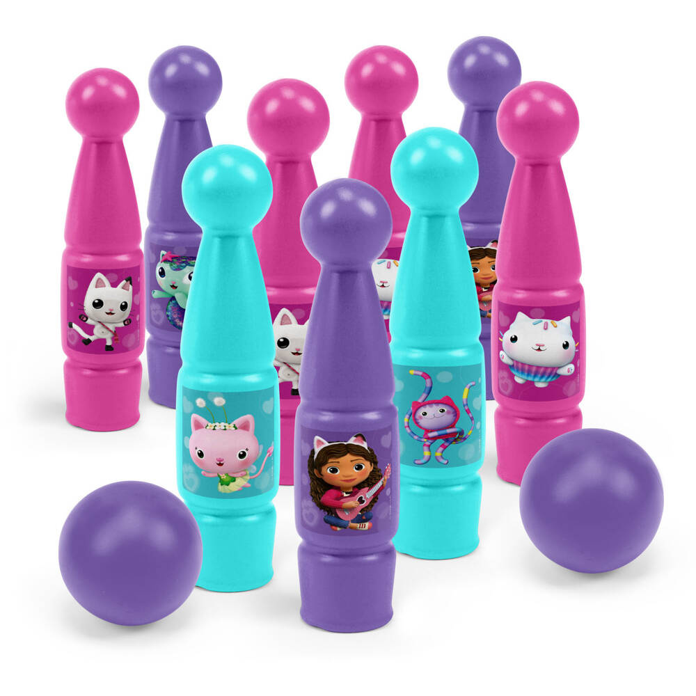 • Komplet zawiera 9 kręgli w kolorach różowym, fioletowym i turkusowym i 2 piłeczki oraz zestaw naklejek z wizerunkiem Gabi i jej kocich przyjaciół.