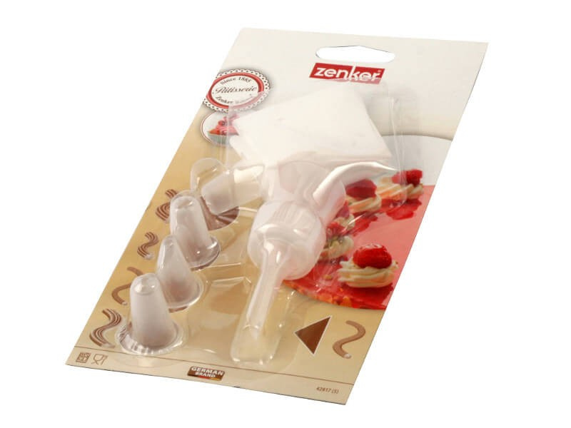 Dekorator do ozdabiania ciast i innych wypieków marki ZENKER niemieckiej firmy Fackelmann zawiera 5 wymiennych końcówek, dzięki którym można w łatwy sposób przyozdobić wypieki. Można go również wykorzystać do nadziewania pączków i rurek.