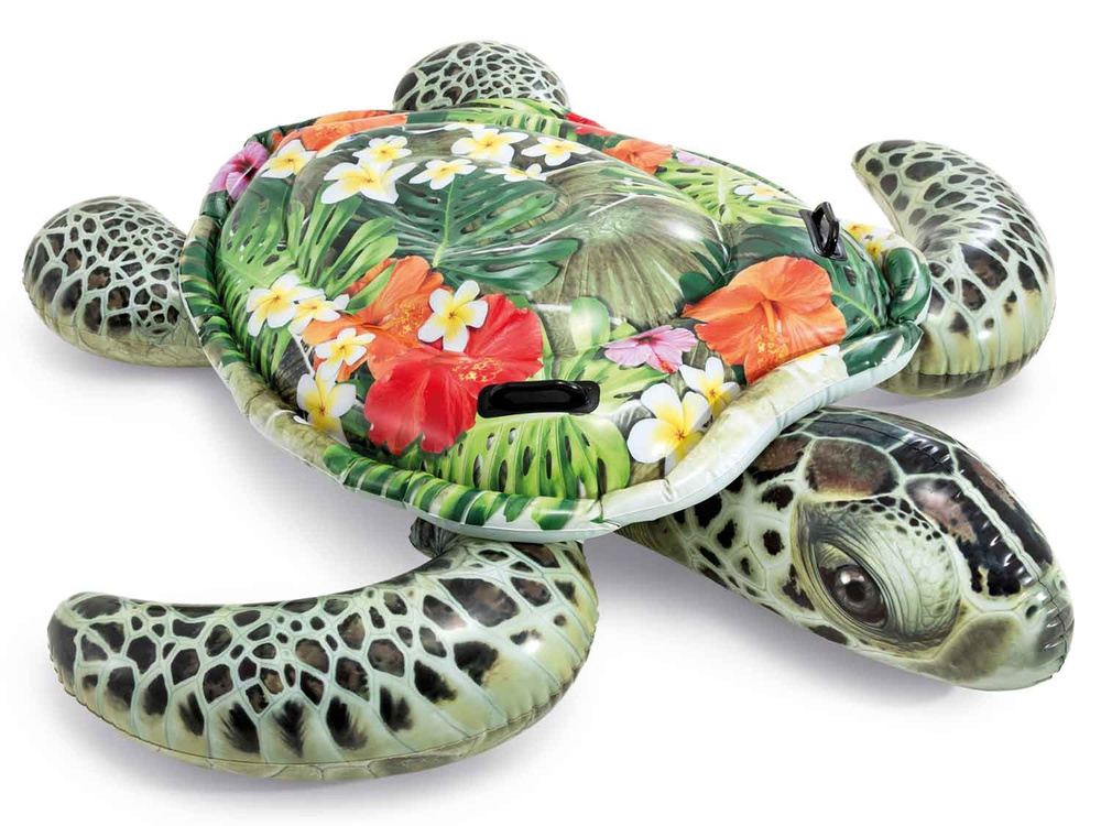 - Zabawka do pływania przypominająca ogromnego żółwia morskiego. Wymiary to 191 x 170 cm. Produkt posiada 2 mocne uchwyty ułatwiające utrzymanie równowagi. Żółw ma 2 oddzielne komory powietrzne, został wykonany z mocnego PCV.
