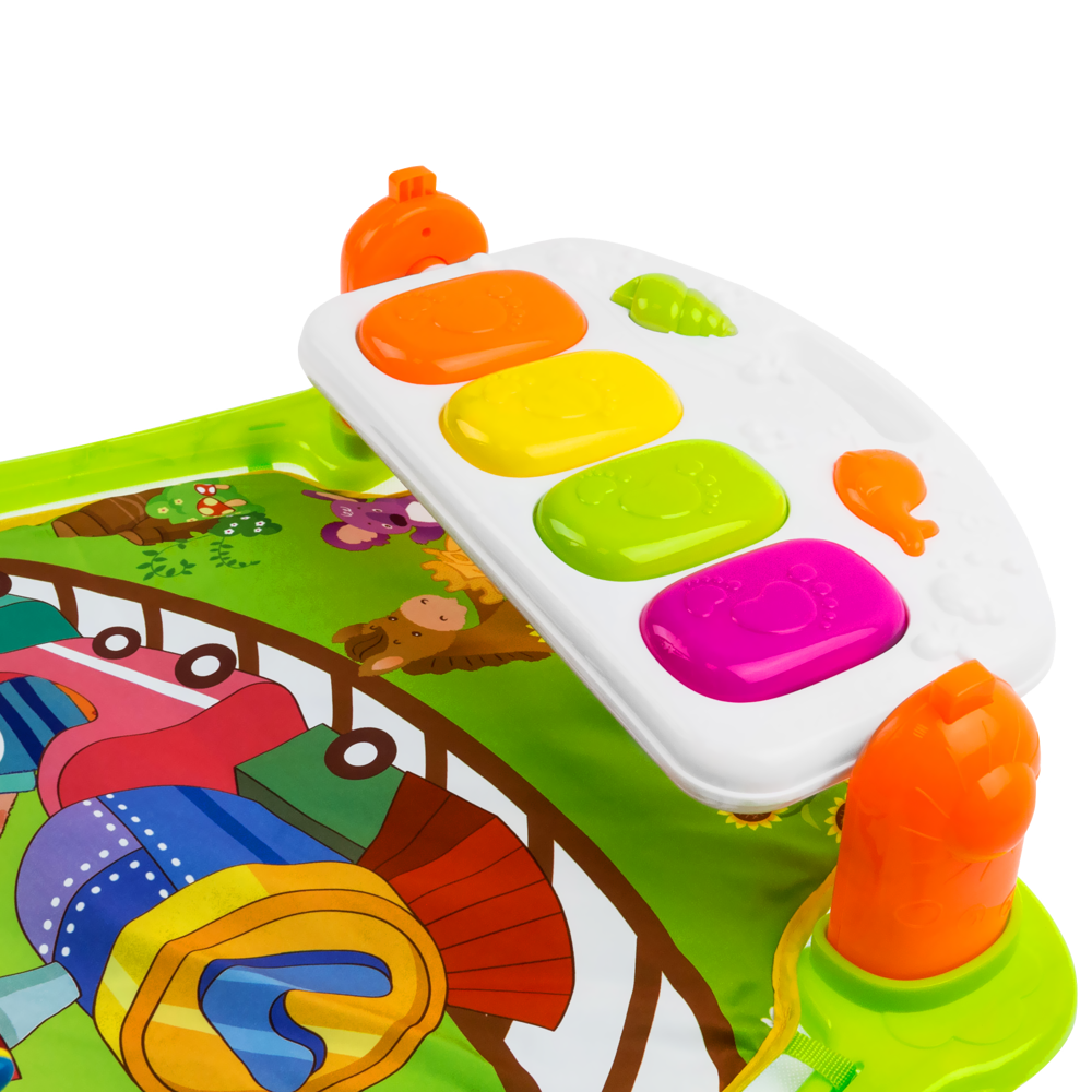 Pianino może zostać ustawione w pozycji poziomej, tworząc jakby stoliczek, przy którym dziecko może usiąść i tworzyć piękne melodie oraz w pozycji pionowej idealnej dla maluszka leżącego na pleckach. Dziecko kopiąc nóżkami uderza w klawisze wydobywając dźwięki. Wspiera to rozwój fizyczny dziecka. Przyciski pianina dodatkowo świecą podczas przyciskania.