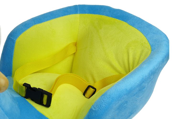 Dla bezpieczeństwa bujak wyposażony jest w fotelik z paskiem zabezpieczającym malucha przed wypadnięciem. W głowie pluszaka zamontowane są mocne rączki ułatwiające utrzymywanie równowagi podczas zabawy.