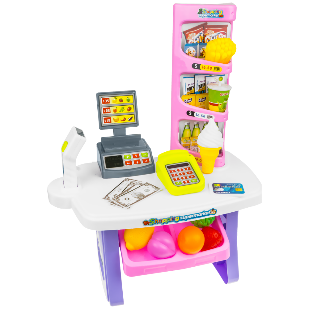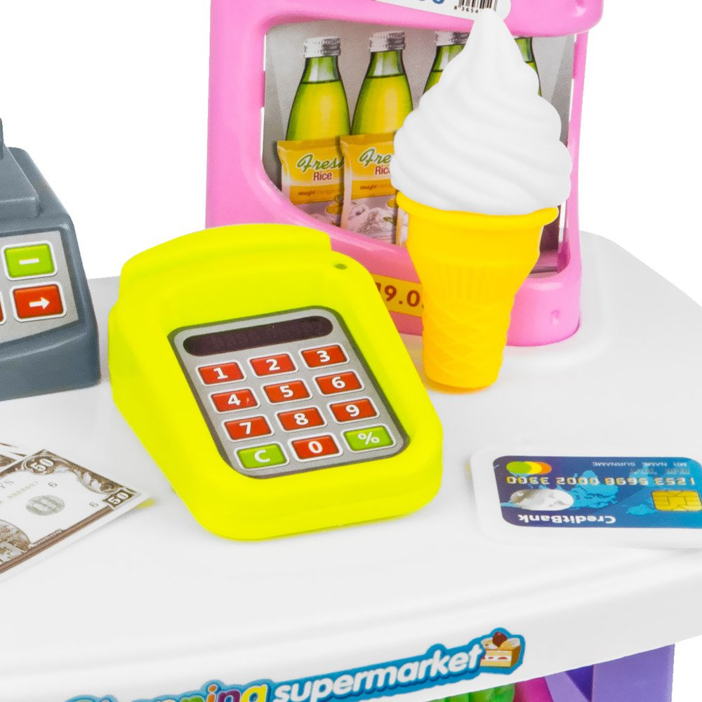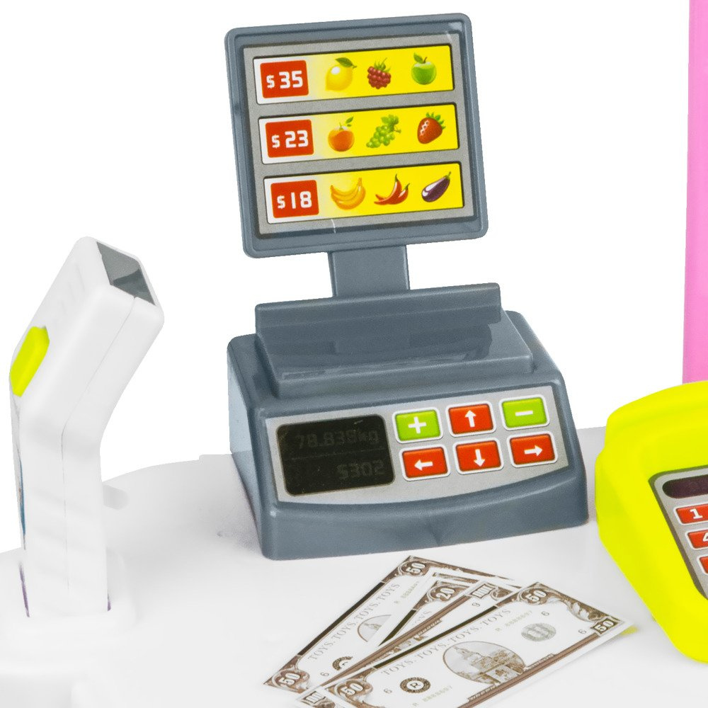 W zestawie znajduje się kasa fiskalna oraz skaner, który świeci i wydaje charakterystyczny dźwięk jak podczas kasowania w prawdziwym sklepie. Kasa posiada wejście przez które można przeciągnąć dołączoną kartę kredytową, co również powoduje pojawienie się charakterystycznego odgłosu. Dodatkowym atutem jest również waga, na której maluch może okładać produkty wymagające zważenia.