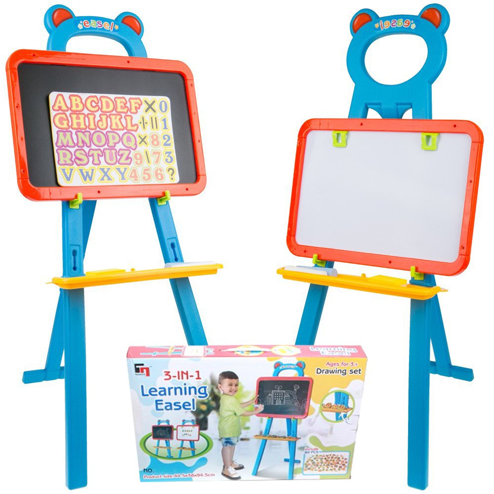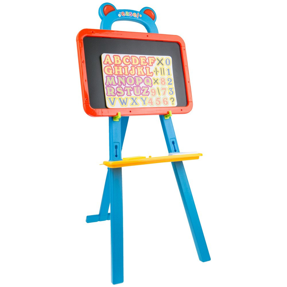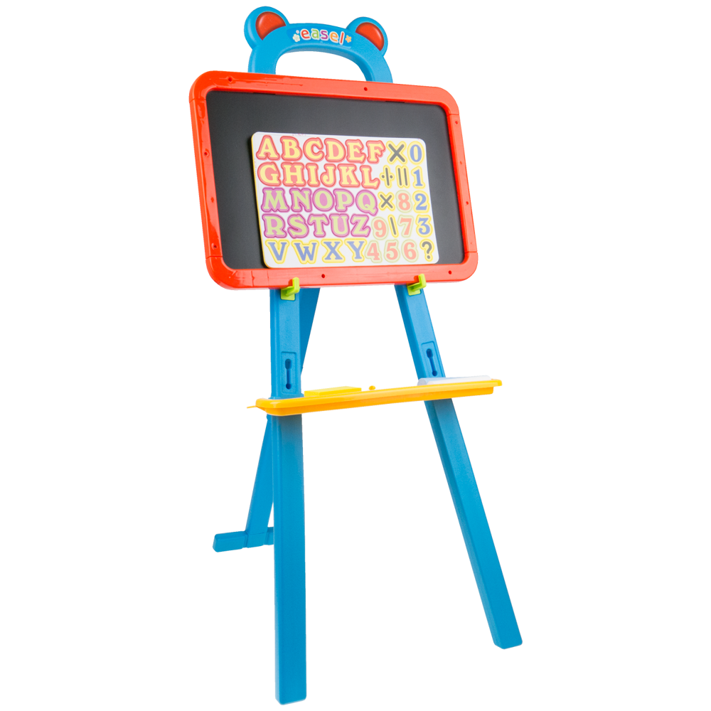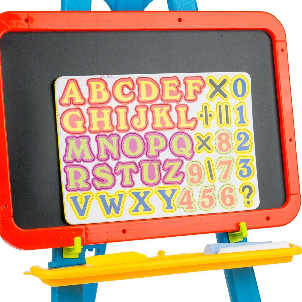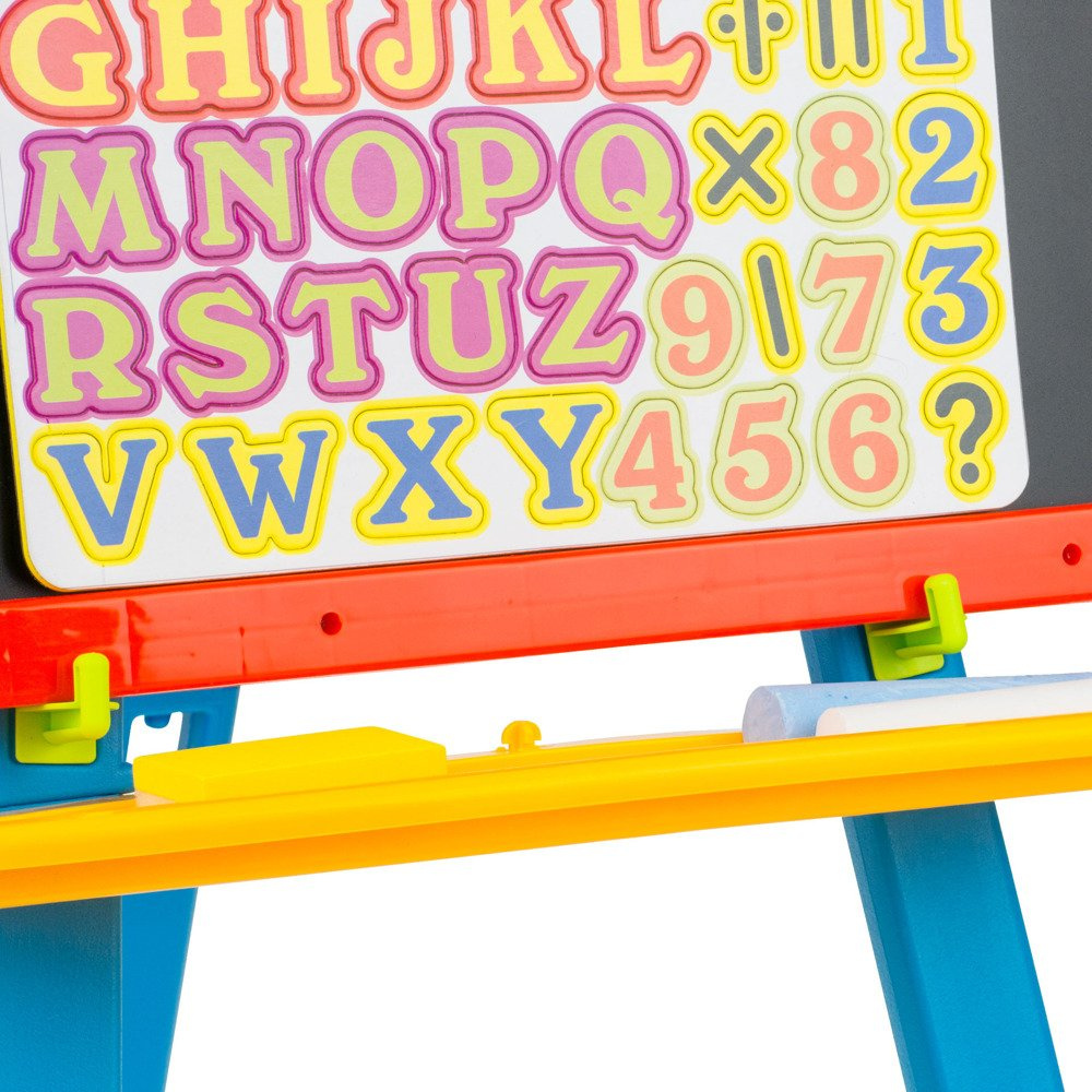 Tablica to aż dwie powierzchnie, na których maluch może rozwijać swoje umiejętności. Z jednej strony jest tablica magnetyczna, na której można umieścić tablicę z cyferkami oraz literkami dołączono do zestawu. Literki można również wyciągnąć i układać z nich wyrazy. Druga strona to tradycyjna tablica kredowa.