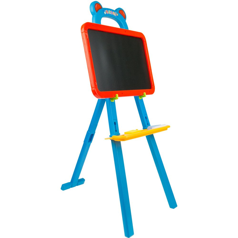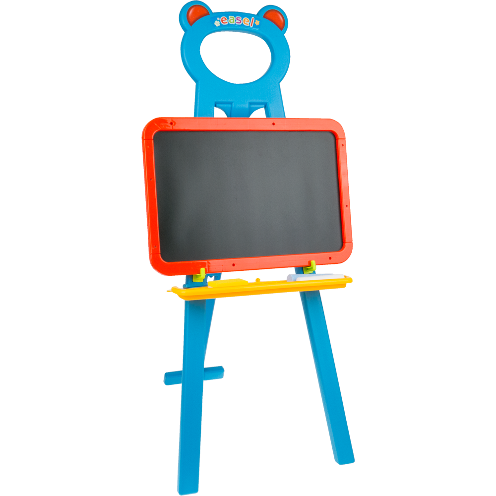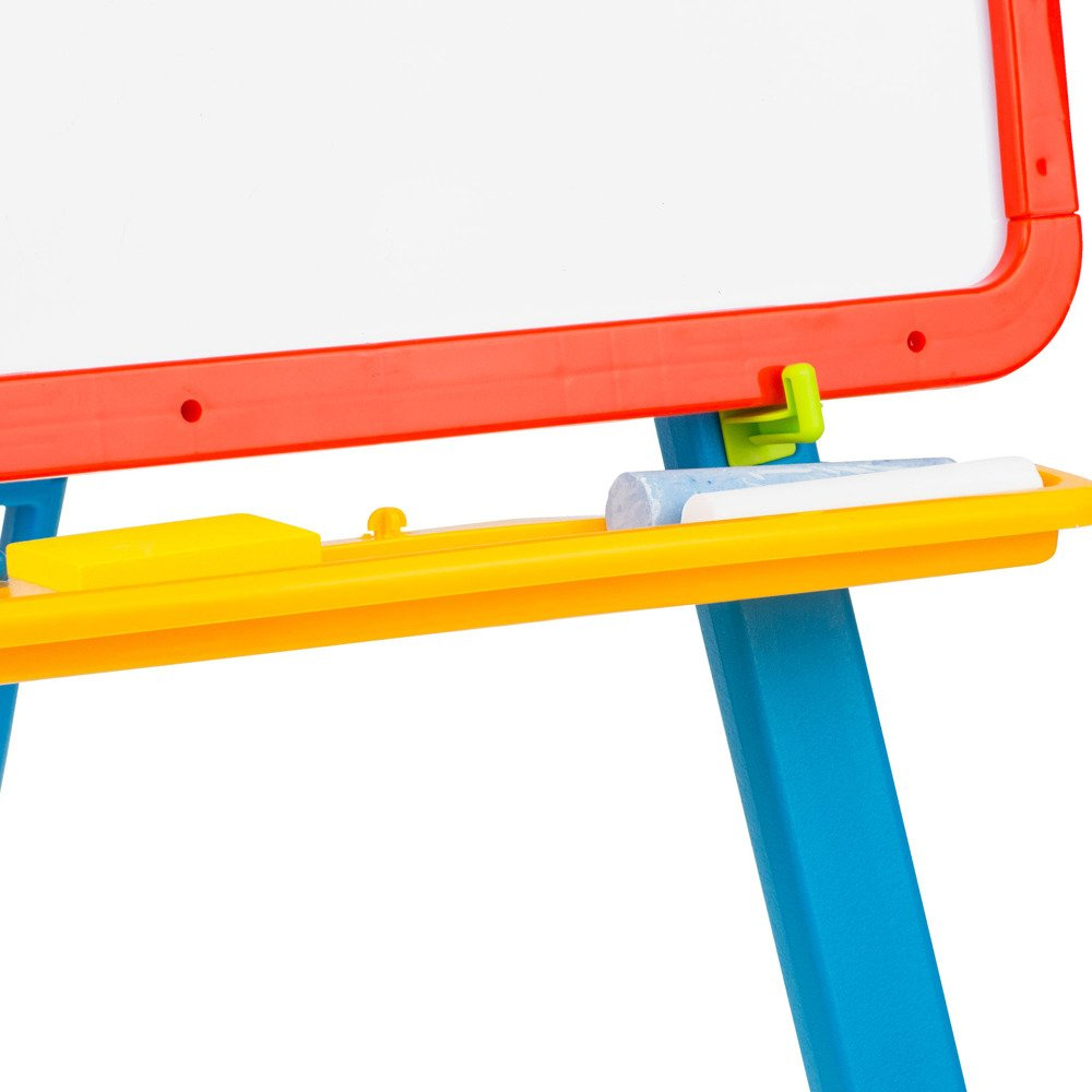 W zestawie maluch znajdzie 2 kredy o różnych kolorach oraz gąbkę do ścierania. Pod tablicami znajduje się półeczka, na której maluch może trzymać potrzebne mu akcesoria.