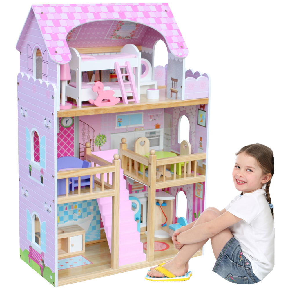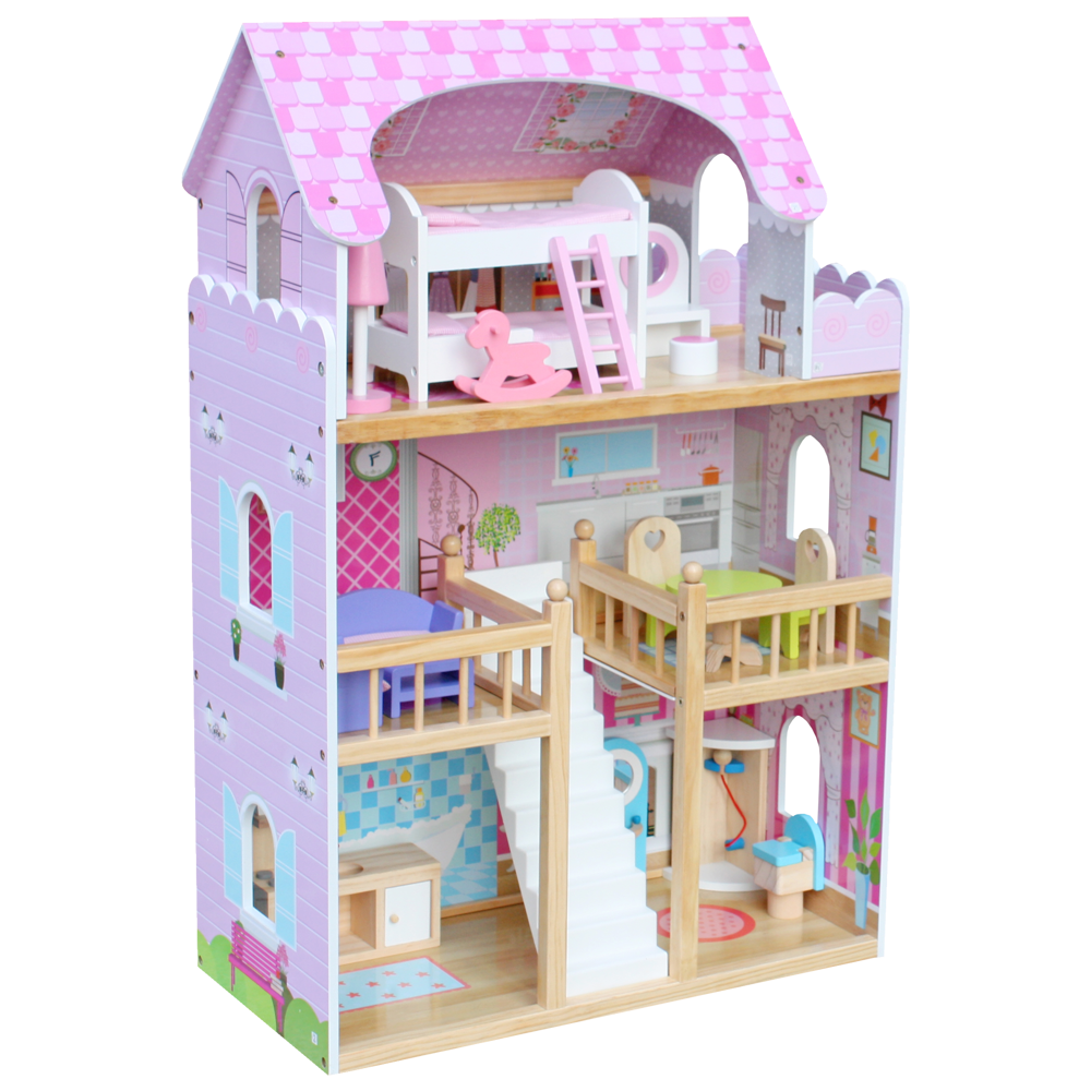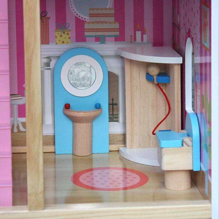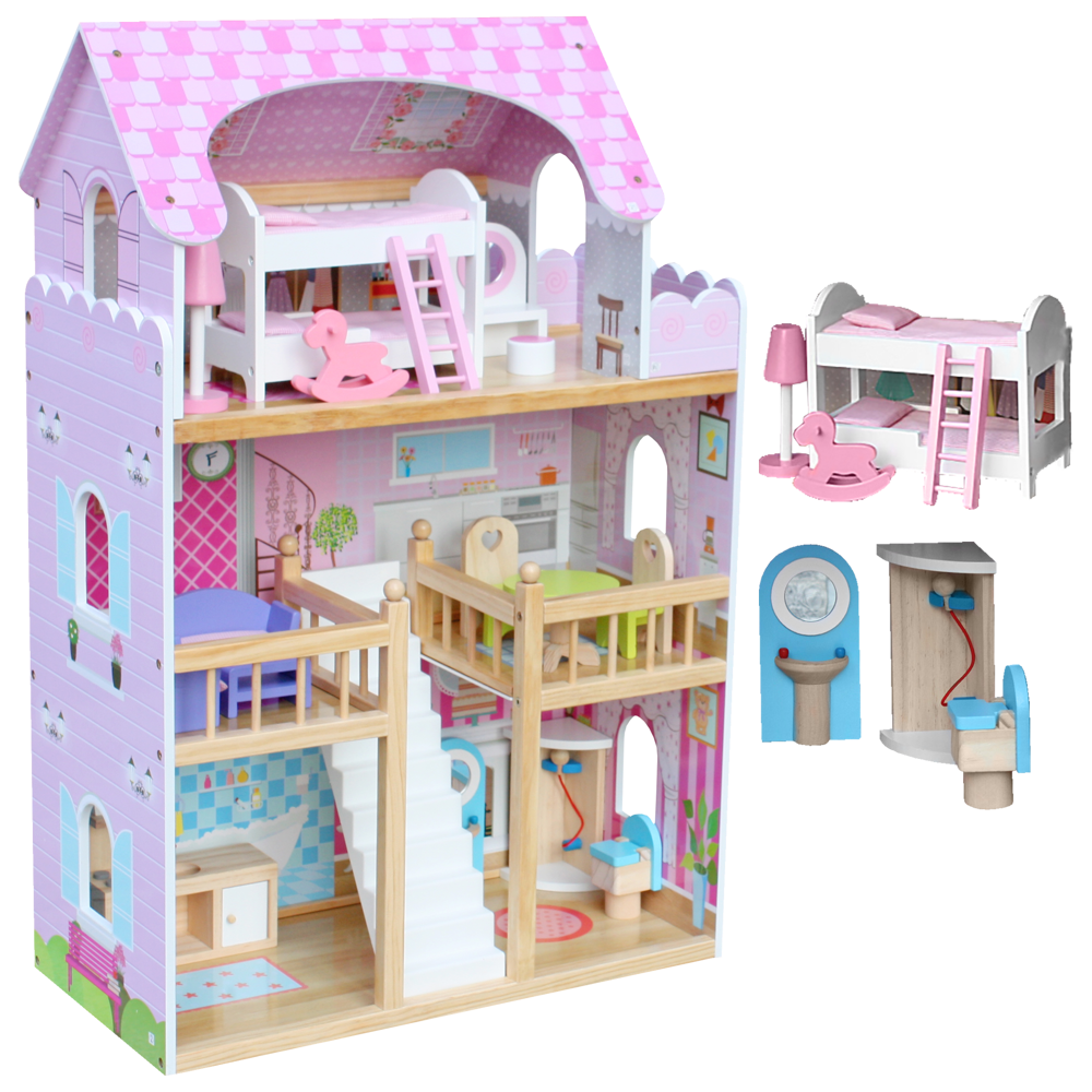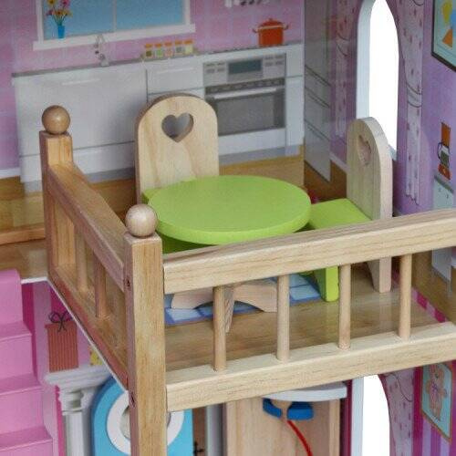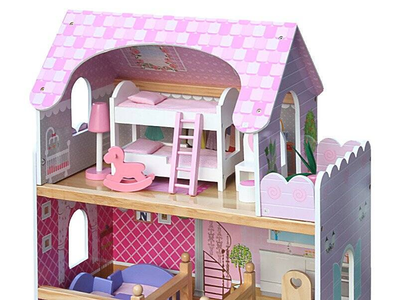 Bardzo duży drewniany domek w kolorze różowym wraz z mebelkami. Dziecko może dowolnie urządzać pokoje mebelkami według swojego gustu. Przekładanie mebelków, tworzenie rożnych scenek przy udziale lalek pochłonie dziecko na długie godziny. To będzie fantastyczna zabawa.