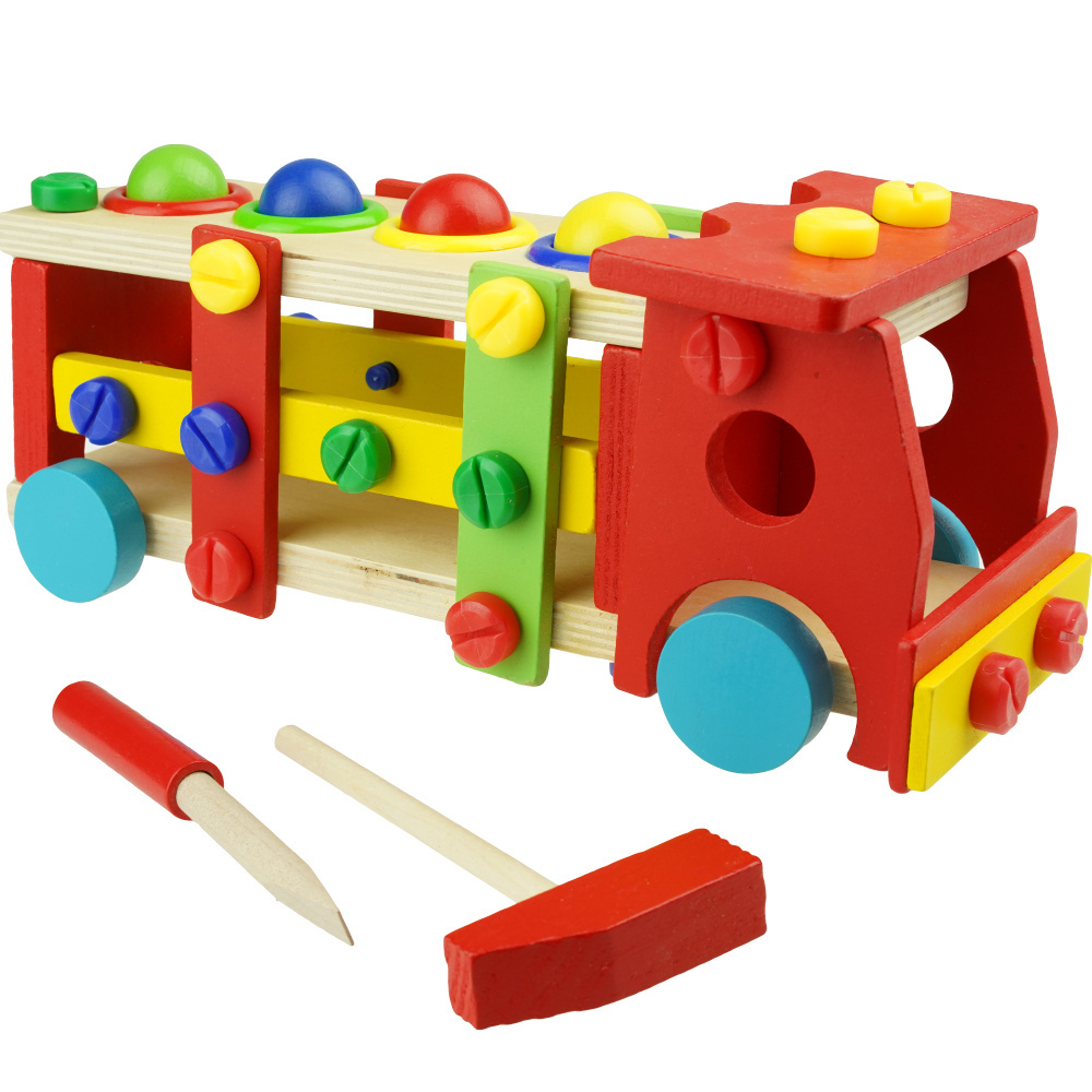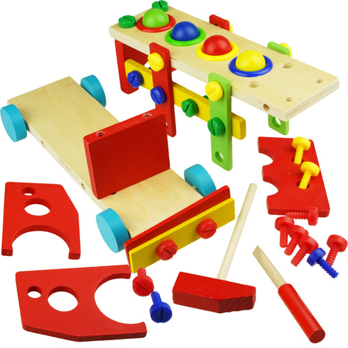 - Rewelacyjna, kolorowa, drewniana zabawka z plastikowymi śrubami do rozkręcania oraz kulami do wbijania.