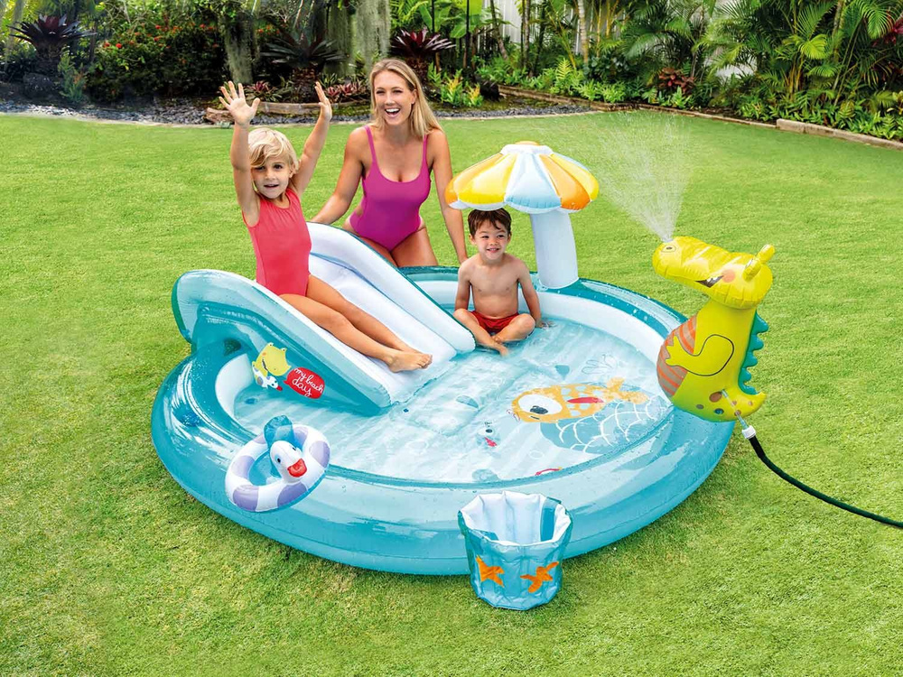 Główną atrakcją jest zjeżdżalnia dająca mnóstwo frajdy, spryskiwacz w formie fontanny tryskający z nozdrzy krokodyla (należy podłączyć wąż ogrodowy), dmuchane kółko dzięki któremu nasi milusińscy poczują się bezpieczniej, kolorowe rybki oraz dmuchane wiaderko do nieustannego przelewania wody, dmuchany daszek by odpocząć i skryć się przed promieniami słońca.