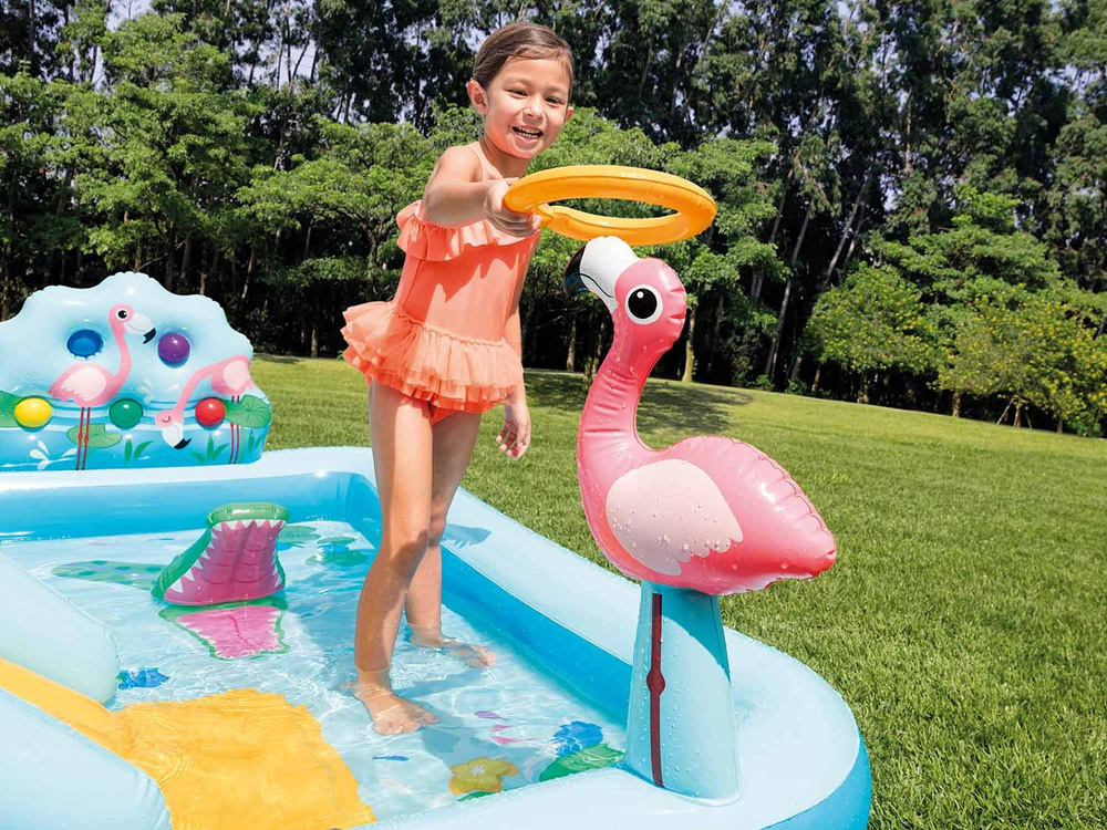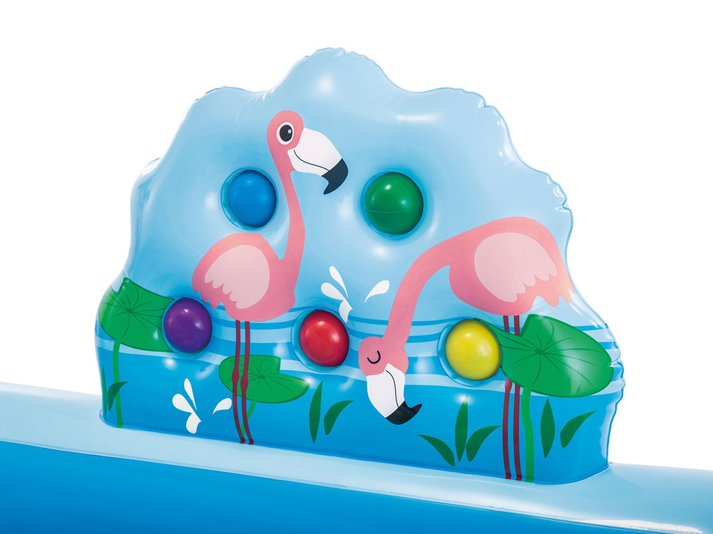 Główną atrakcją jest zjeżdżalnia dająca mnóstwo frajdy, spryskiwacze w formie fontanny tryskające z boków basenu (należy podłączyć wąż ogrodowy), dmuchane palmy, hipopotam, aligator i huśtająca się małpka, kolorowe piłeczki (5 szt.) pasujące do otworów w nadmuchiwanej ścianie, dmuchany różowy flaming pozwalający na grę w rzutki.