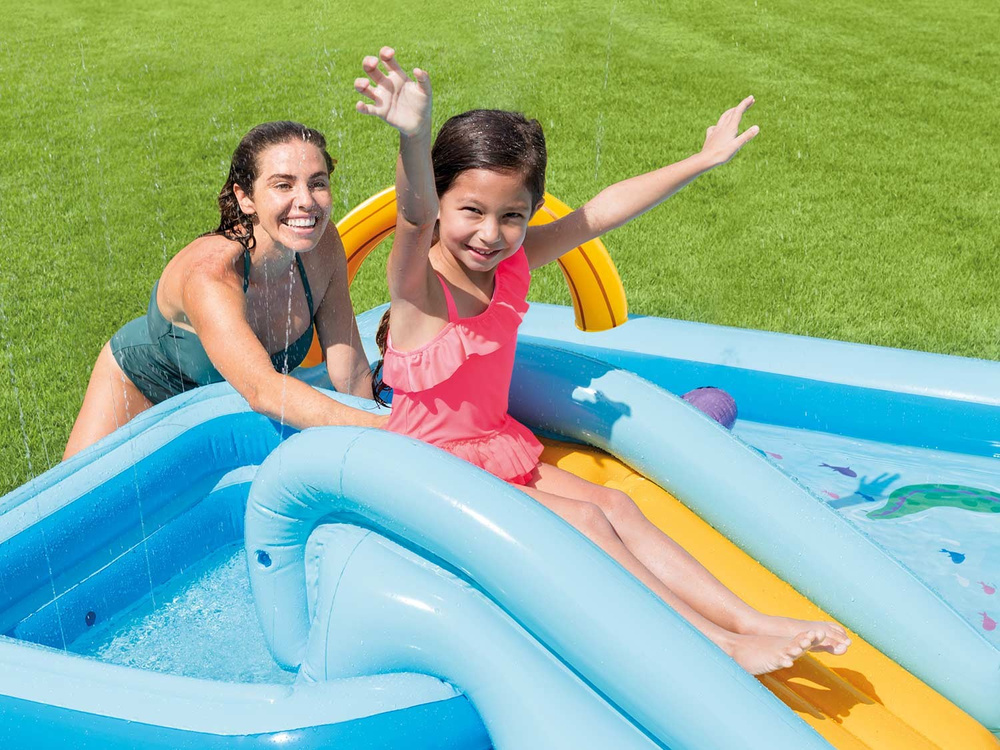 - Dmuchany, wodny plac zabaw z brodzikiem, zjeżdżalnią, tryskającą wodą i dmuchanymi zabawkami. Idealnie rozwiązanie na upalne, letnie dni.