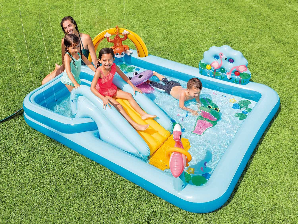Atrakcyjna kolorystyka, palmy, tryskająca woda, wraz z zestawem ciekawych akcesoriów, dmuchanych zwierząt wprost z dżungli, sprawią dużo radości dzieciakom i pozwolą spędzić wiele godzin na wspaniałej zabawie pod czujnym okiem dorosłych.